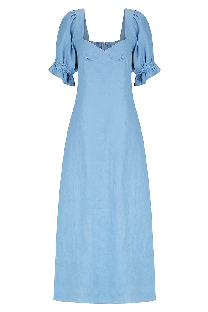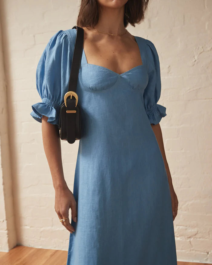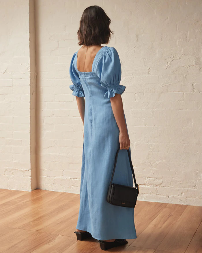 The Palomi dress exudes vintage-inspired charm and is the very definition of effortless elegance. The romantic piece has a sweetheart neckline with contrast stitching to beautifully highlight the shape of the bust. Cut from natural fibres, it has a slim bodice and flowy full-length skirt, both of which are traced with delicate ruffles on the blouson sleeves. The lovely blouson sleeves sit just above the elbow with shirred cuffs for comfortability. Style yours with slides or loafers.
