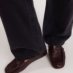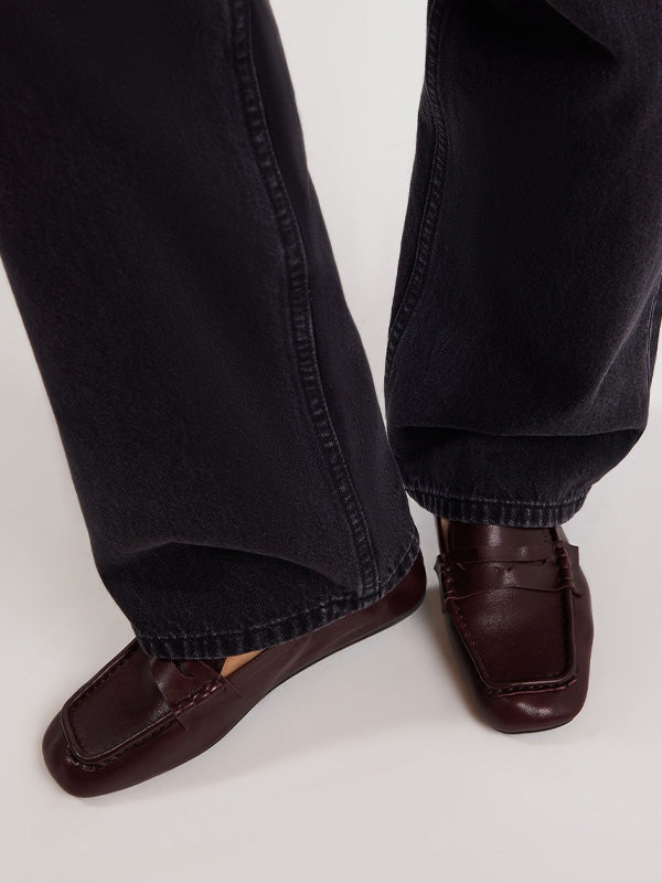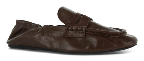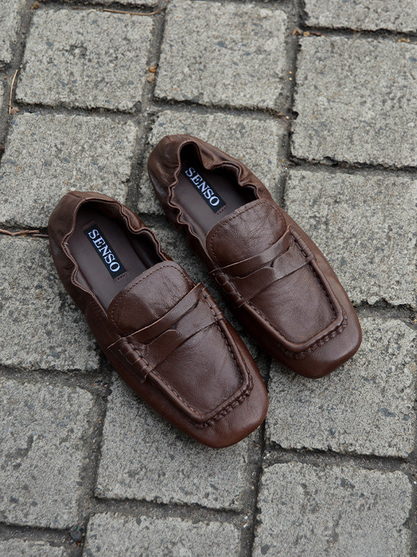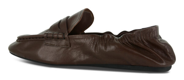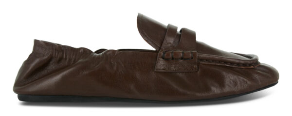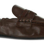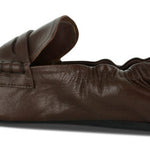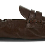 Brown distressed authentic leather loafers featuring a ruched heel and rubber sole