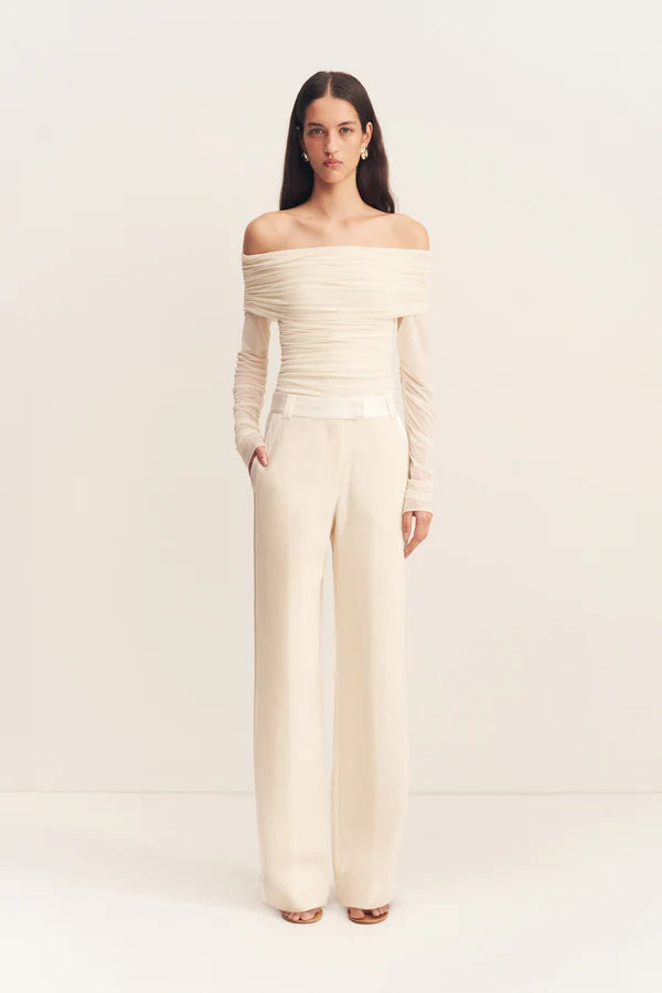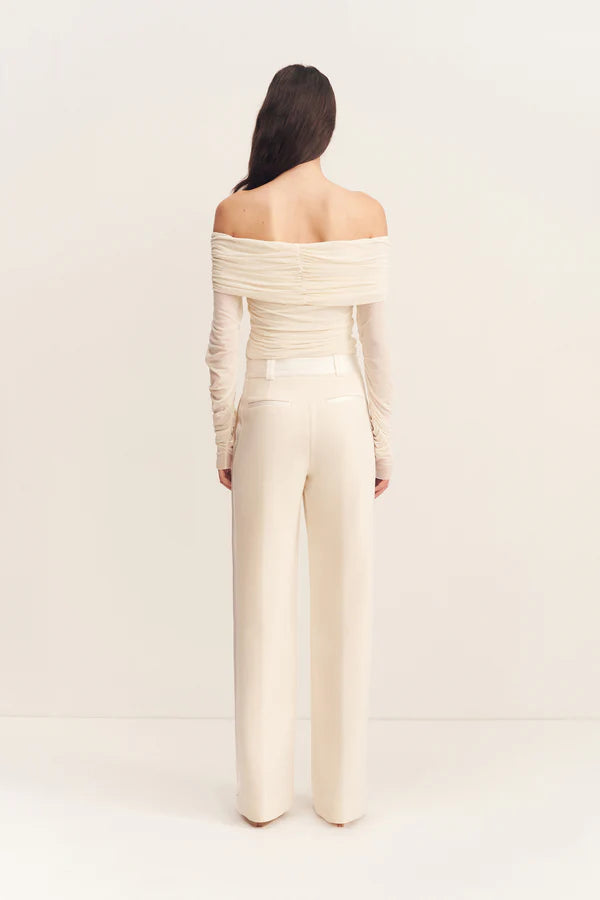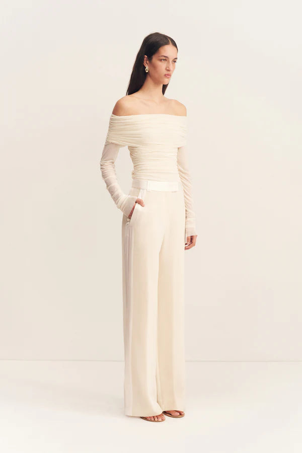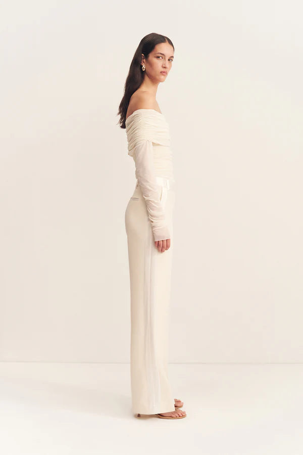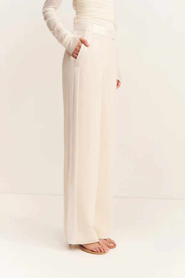 Tuxedo side panel pant in rice in a traditional suiting contrasted with a luxurious satin acetate.