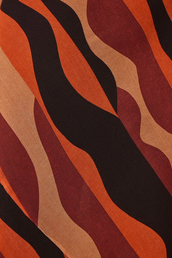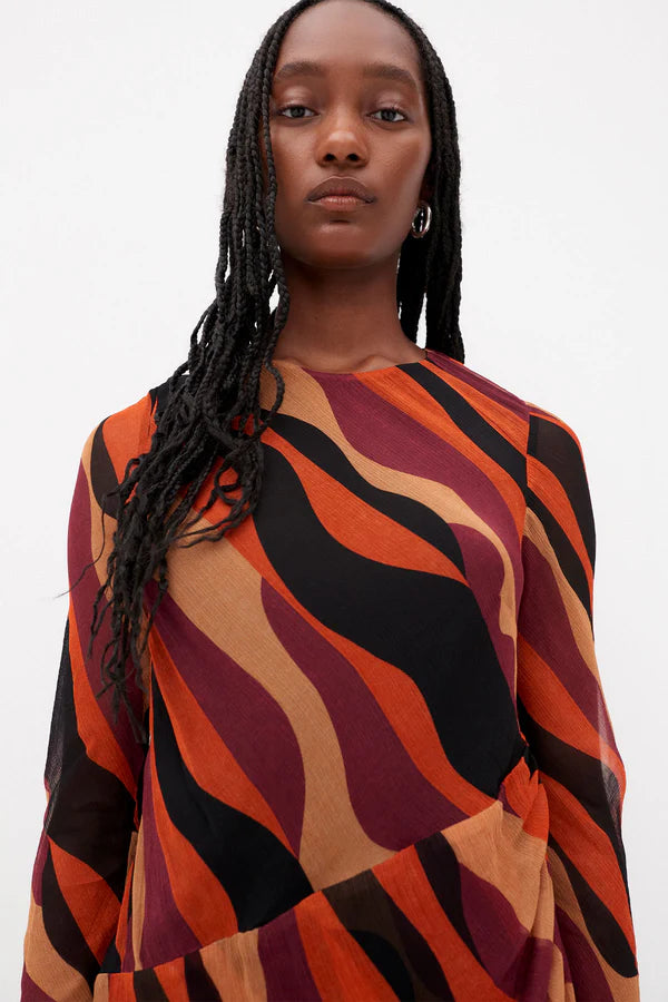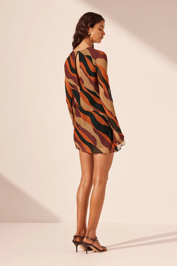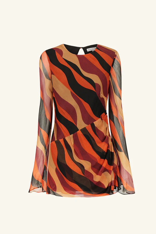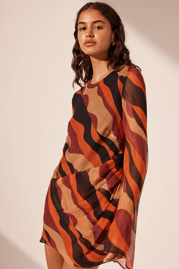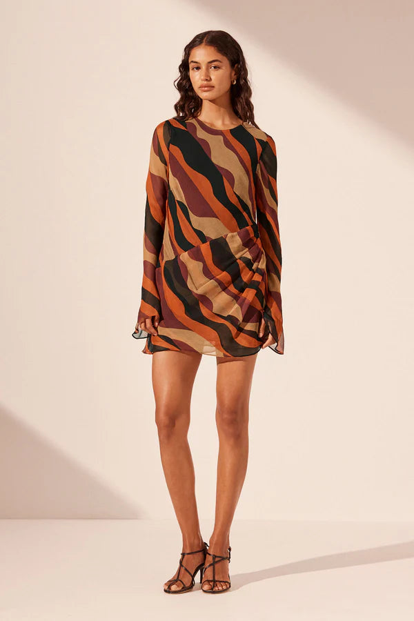 Long sleeve gathered mini dress in a light weight semi-sheer chiffon in the Anita print.