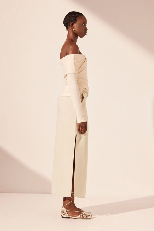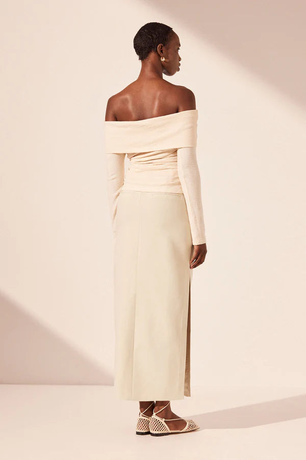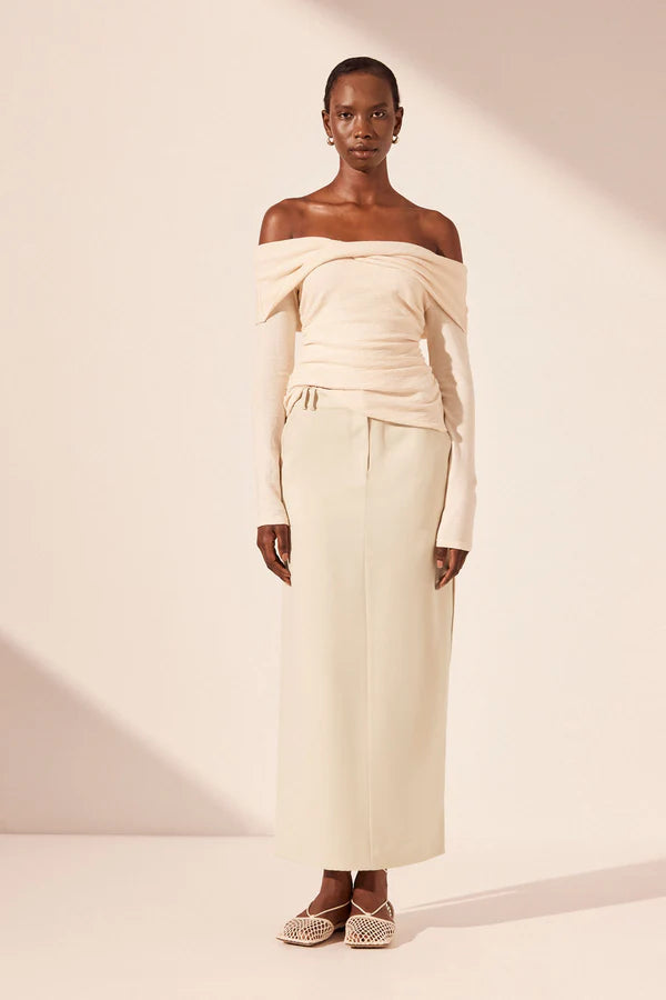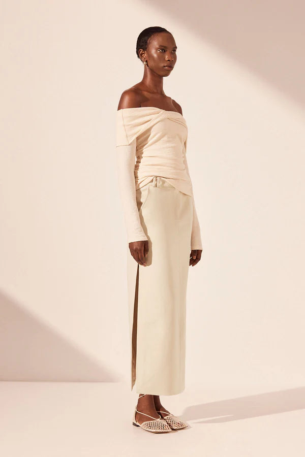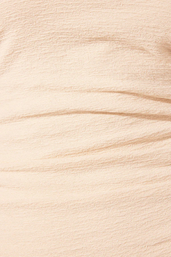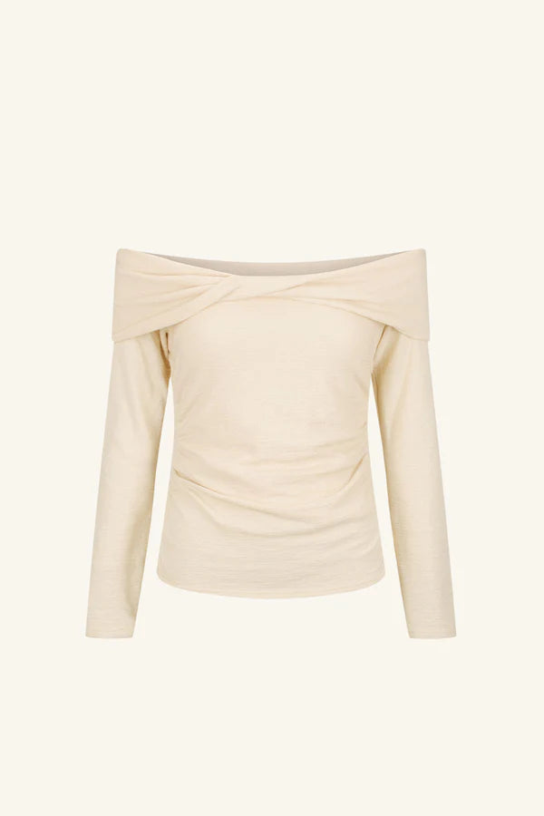 Off shoulder twist front top in macadamia in a soft cotton jacquard.