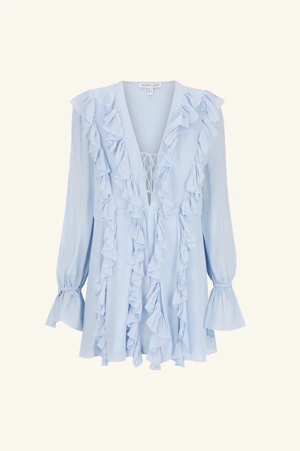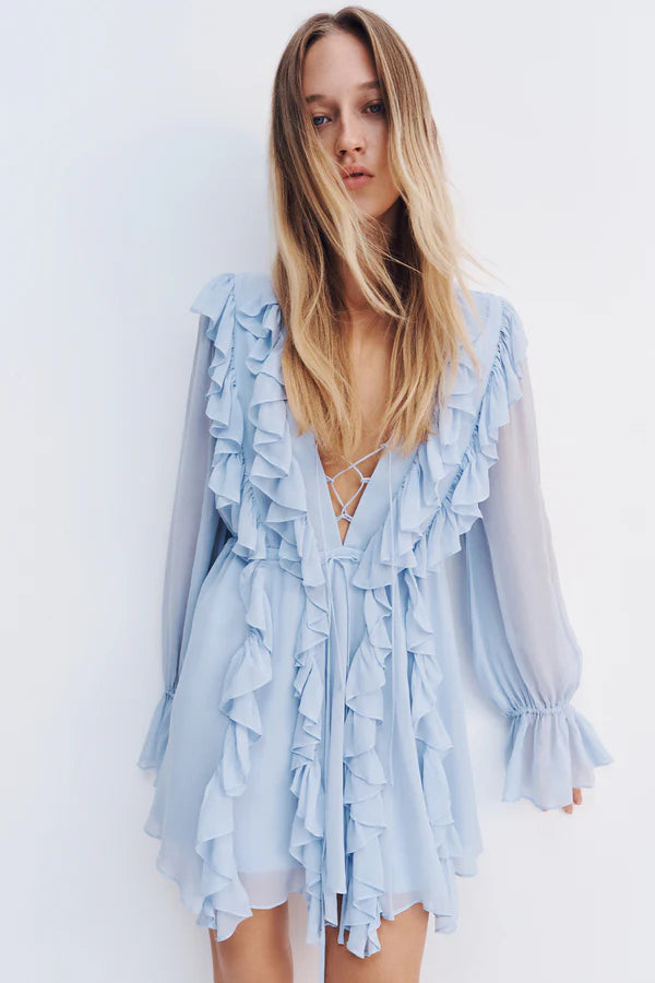 Long sleeve ruffle mini dress in arcadian blue in a semi-sheer georgette.