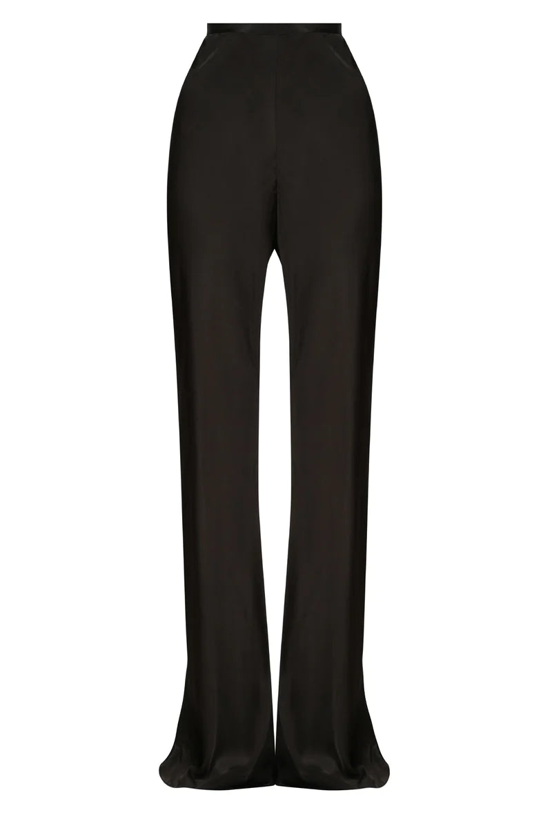 High waisted flared bias cut pant in a silk touch fabric with a luxurious sheen.
