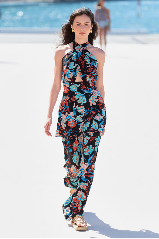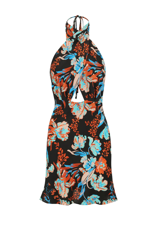 Cross front halter mini dress in the exclusive Flotte print in a luxurious silk.