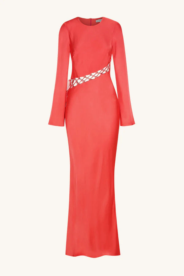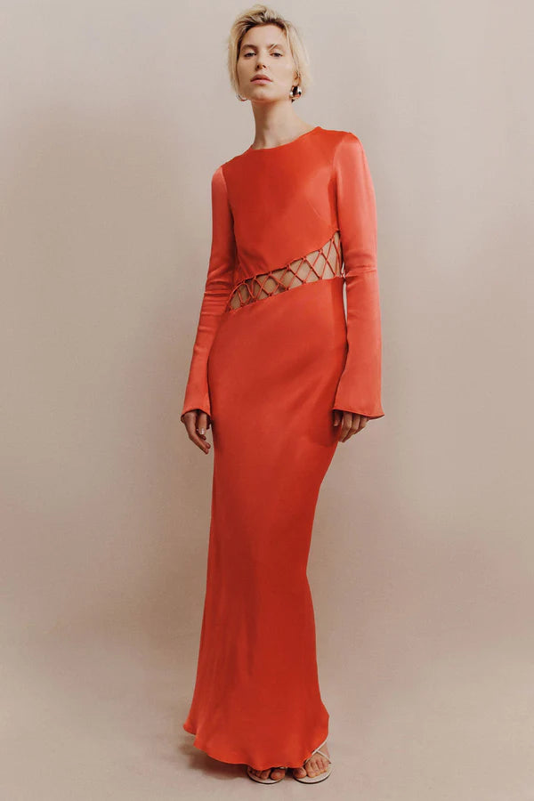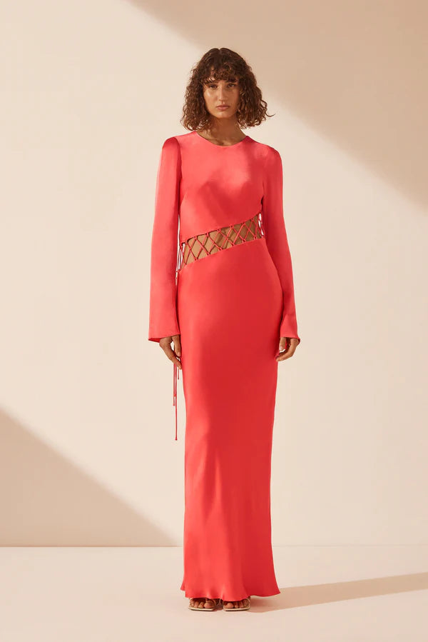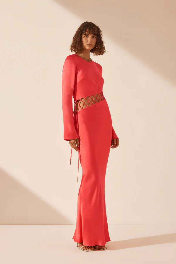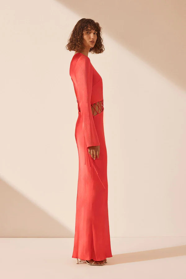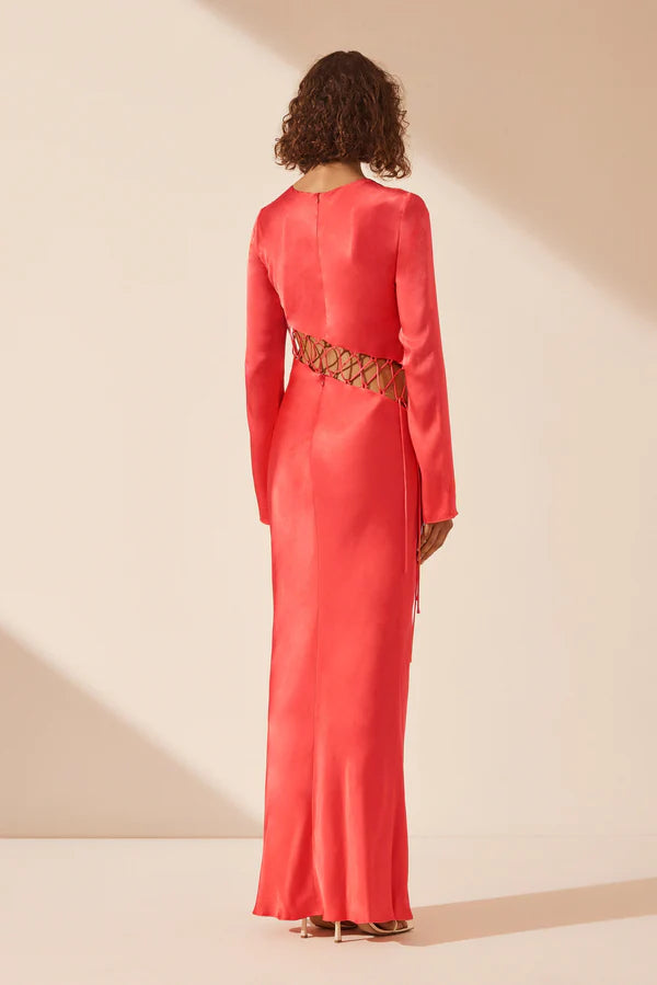 Long sleeve maxi dress with asymmetrical lace up detail in a LENZING™ ECOVERO™ with luxurious satin finish.