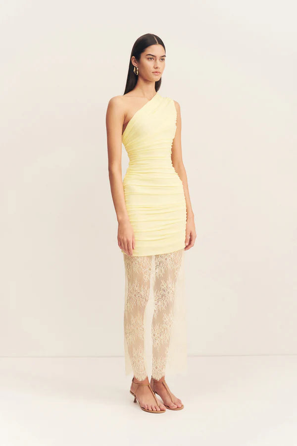 Asymmetrical one shoulder maxi dress in sherbet yellow in a sheer mesh contrasted with a sheer lace.