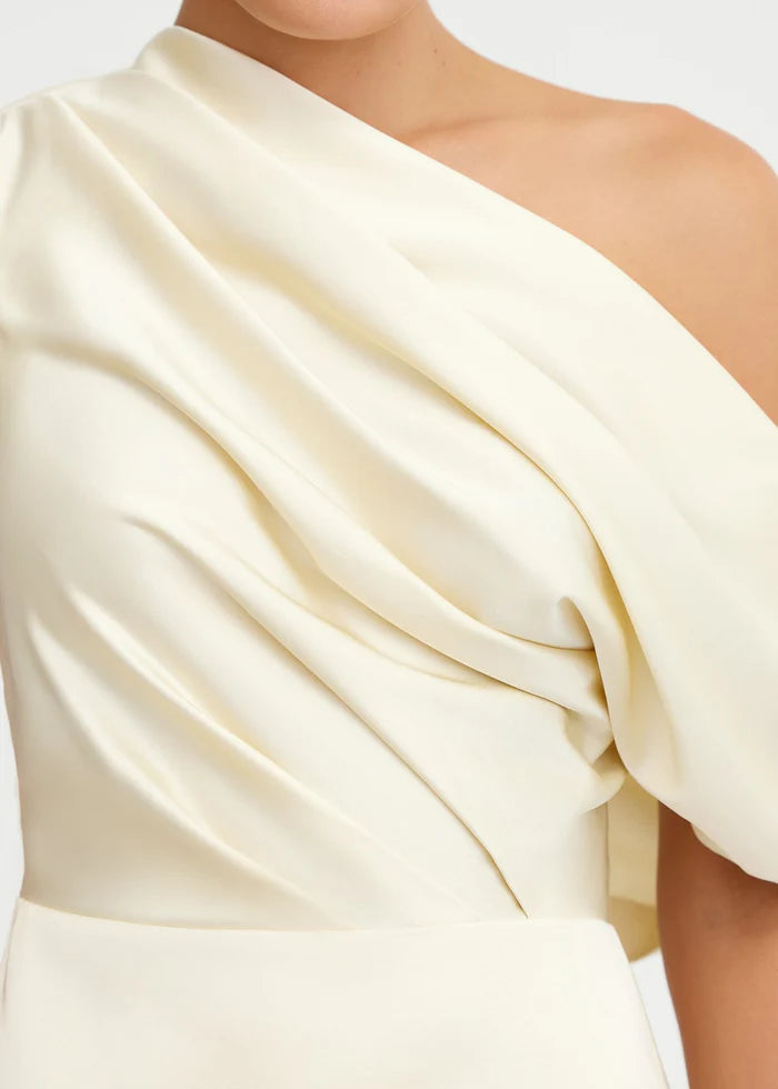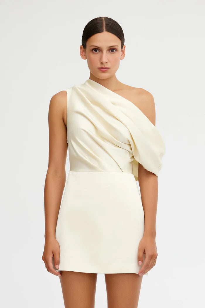 Elevate your look with the Adriana Mini Dress in Pearl crafted from our signature occasion satin. Featuring a lined skirt and an unlined bodice, this dress is designed with an asymmetrical, draped bodice and a neckline that falls off one shoulder.