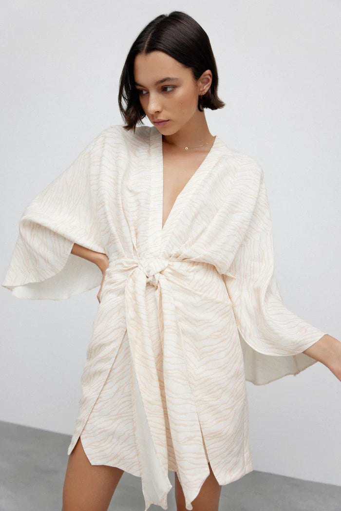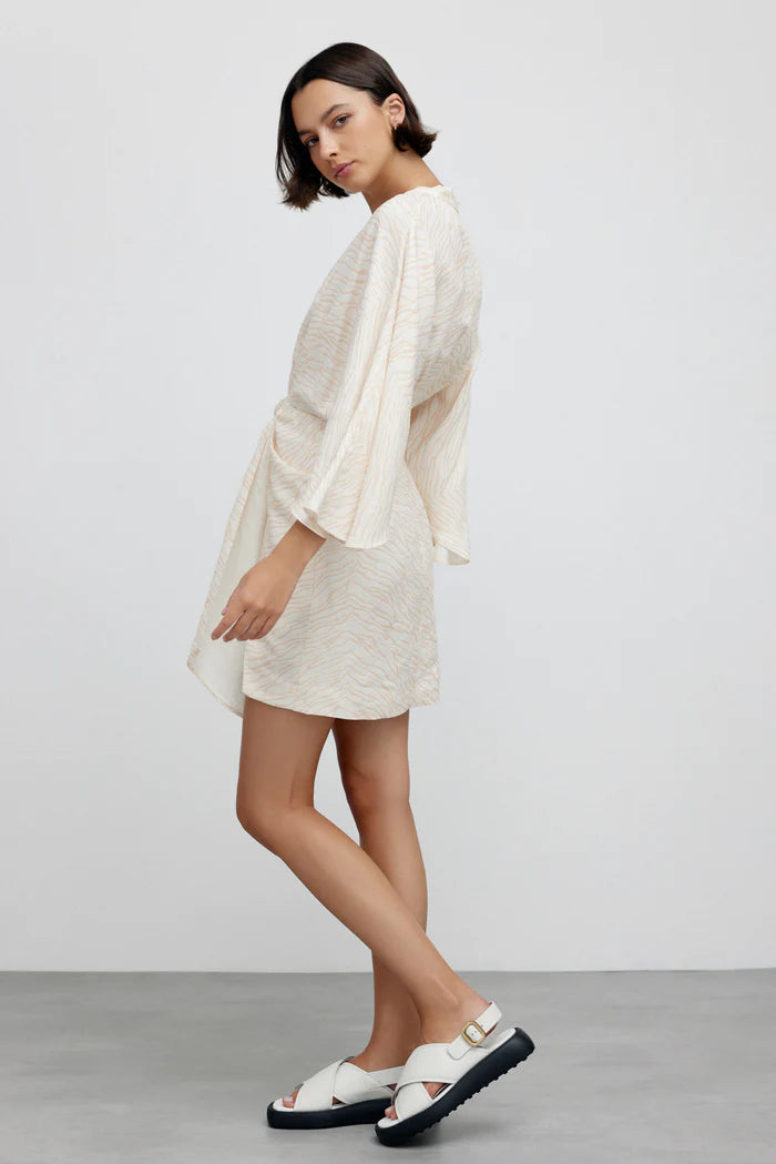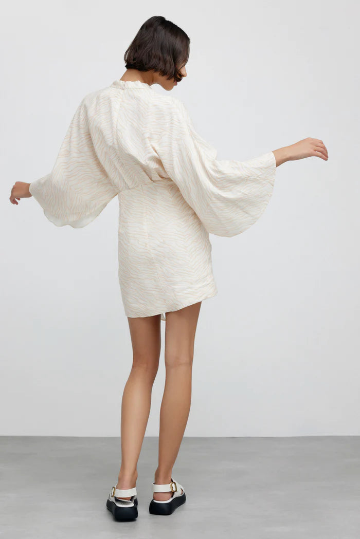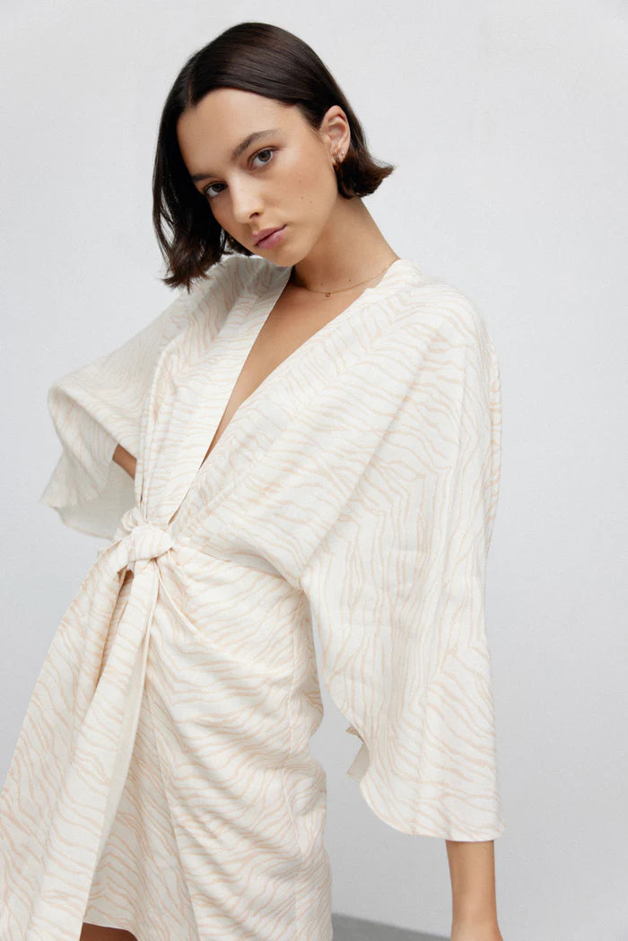 Designed to be a relaxed fit, the Lola Dress in Ivory is the perfect style to take on holiday with you. Featuring a plunging neckline, relaxed batwing style sleeves and front tie detail with draping fabrication. This piece is fitted at he waist, creating an elegant silhouette.