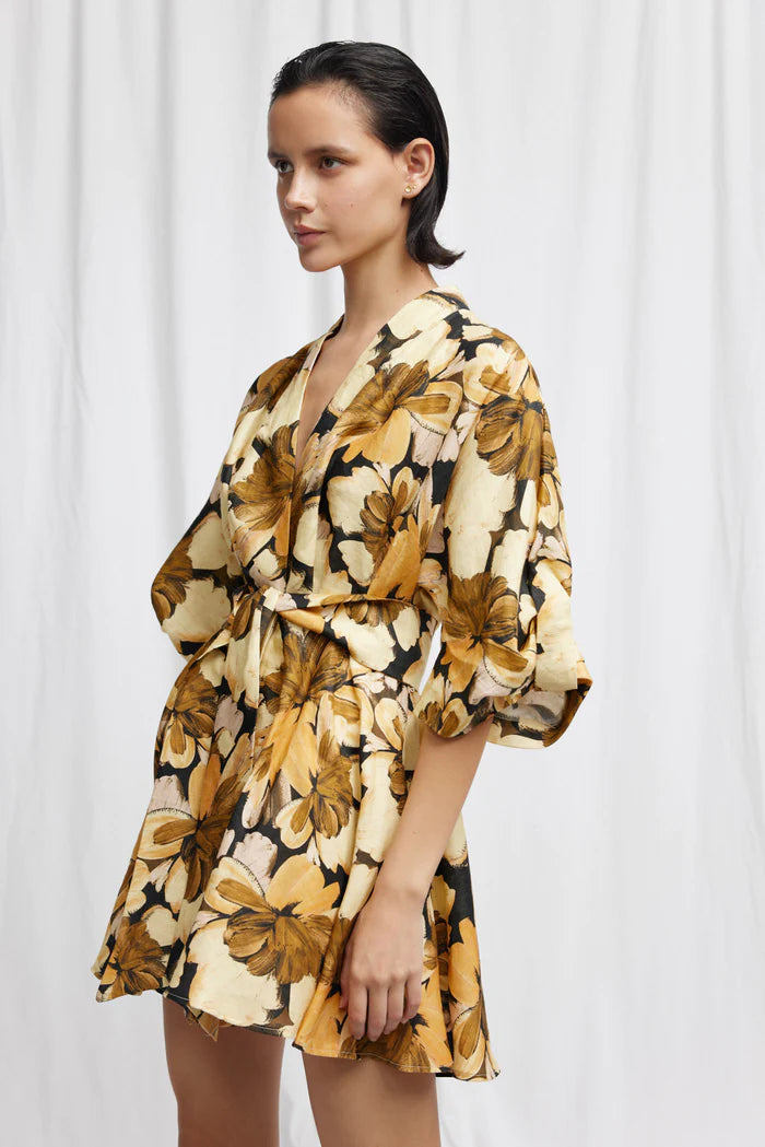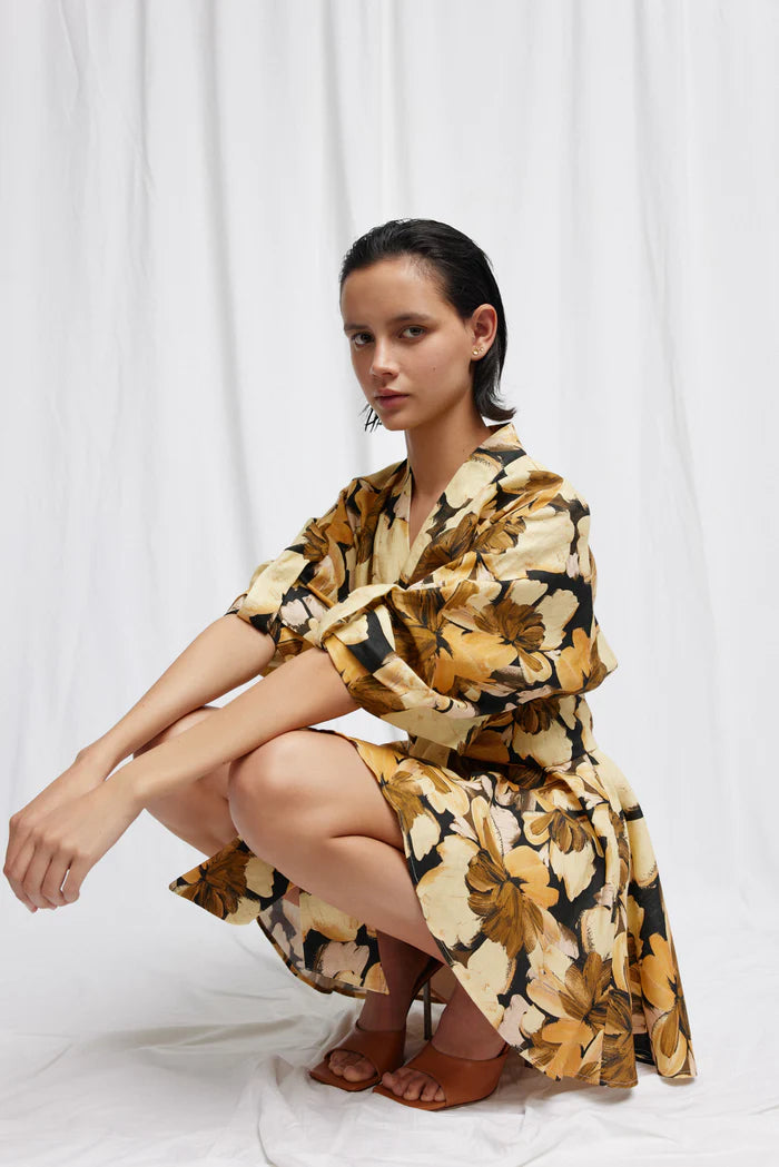 A sweet addition to the collection, crafted with warmer days in mind. The Myra Mini Dress in Dark Painterly is designed to be an effortless silhouette. Relaxed fit, accentuated sleeves, fluted skirt and removable waist belt. Pair with a simple slide for an every day look, or evaluate with a block heel.