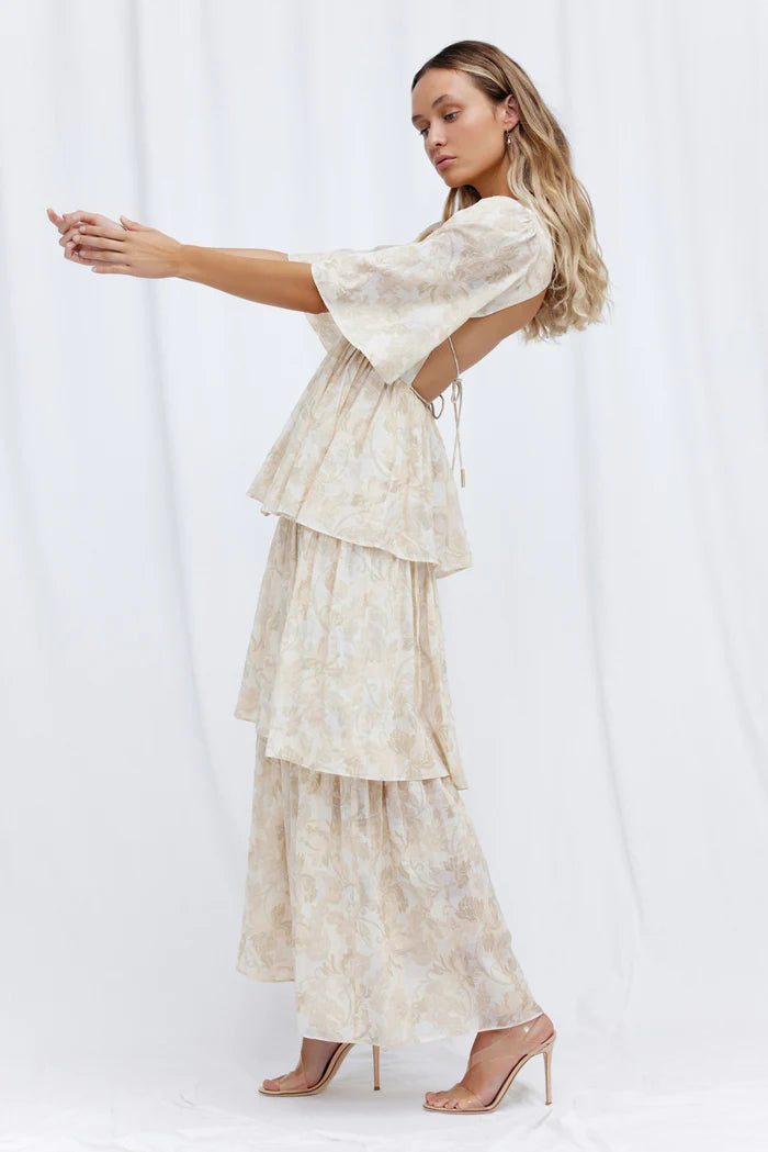 A carefully created silhouette ~ the Scarlett Maxi Dress in Almond Stencil Floral is crafted from a soft cotton blend fabrication. Elbow length sleeves, V-neckline and tiered fabrication flowing effortlessly toward the hem. Your go to beach to bar dress this season.