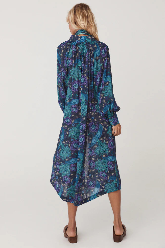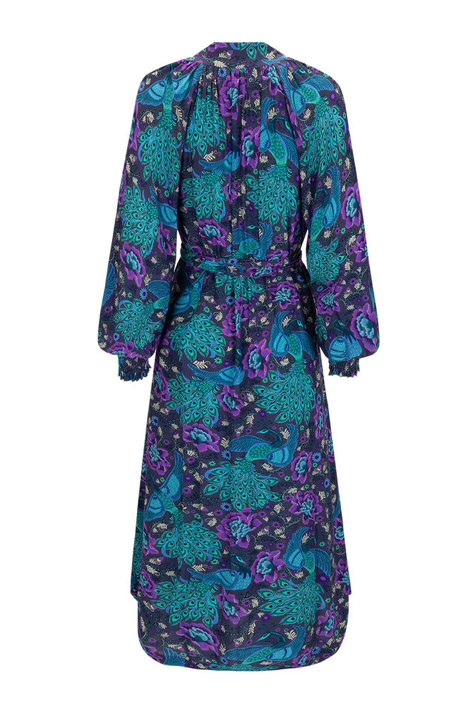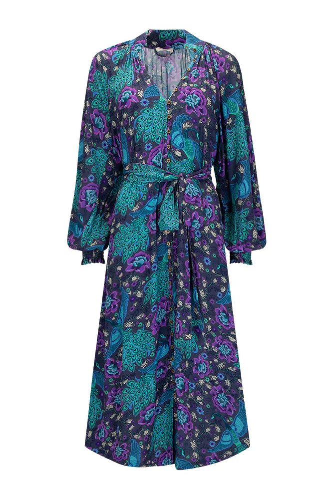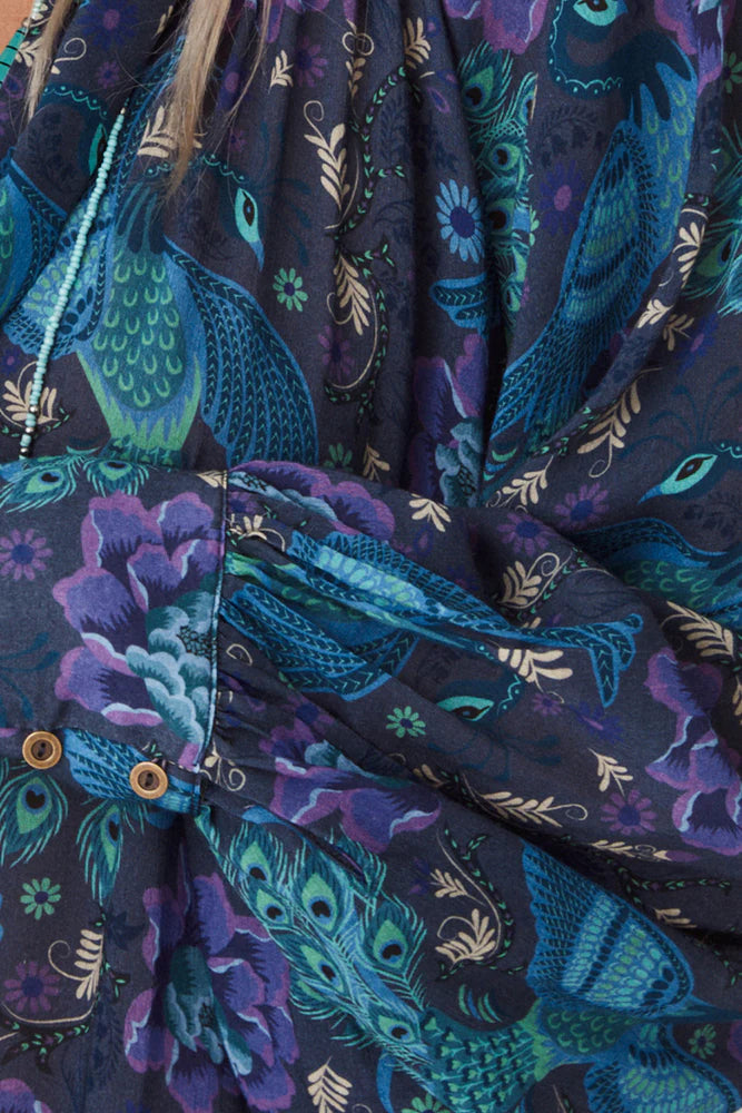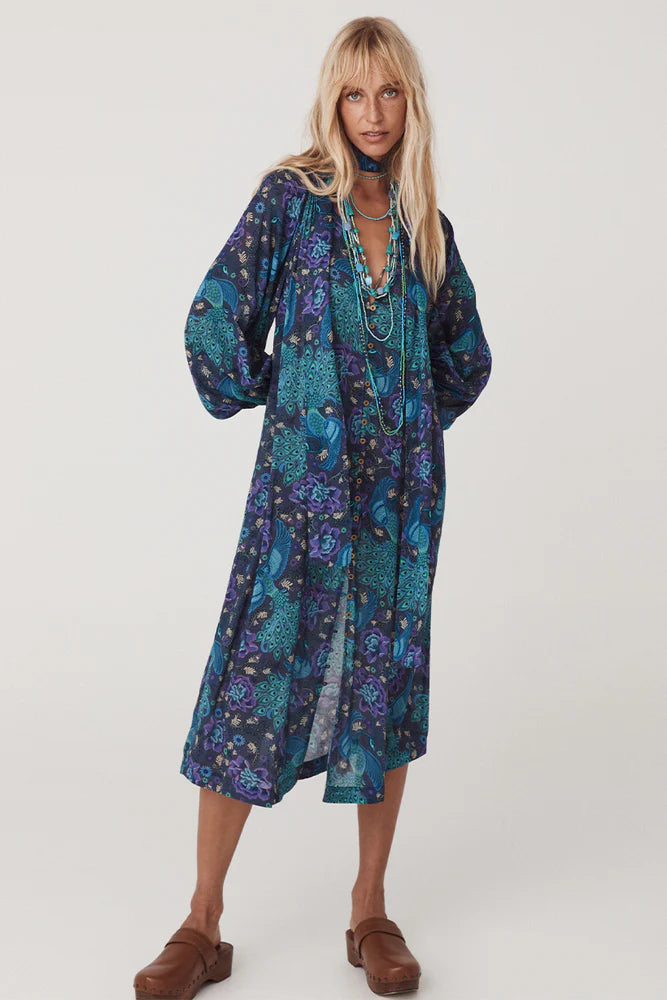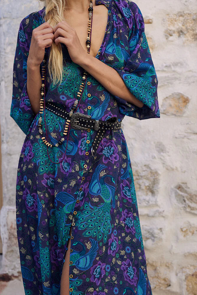 Release your inner rock goddess with the Bohème Button Through Midi Dress in Baltic. Striking deep blue, purple and green hues effervescent like the peacock feather, colour the hand-drawn peacock motifs and other worldly blooms in an all over print masterpiece.