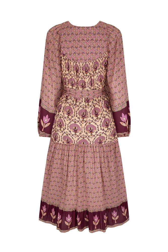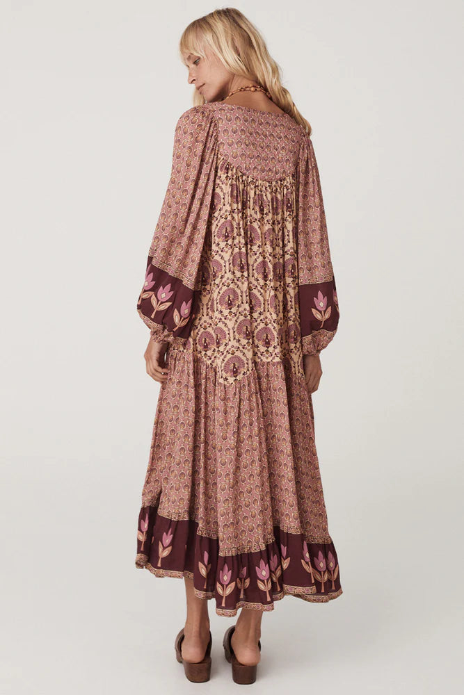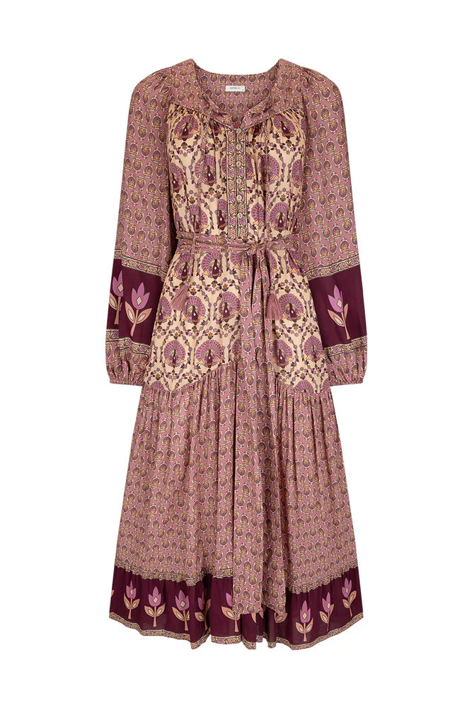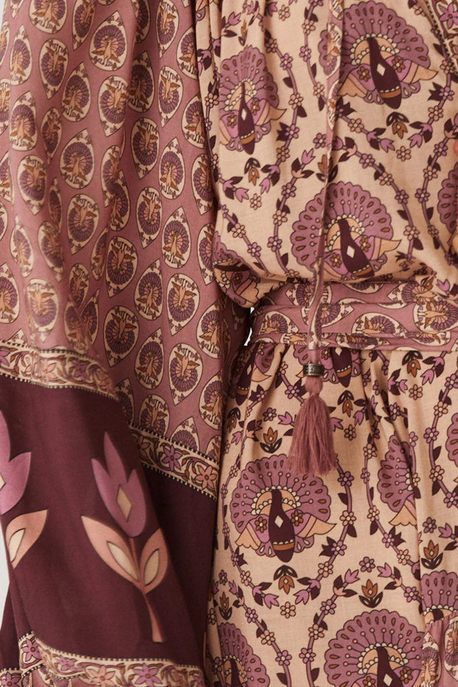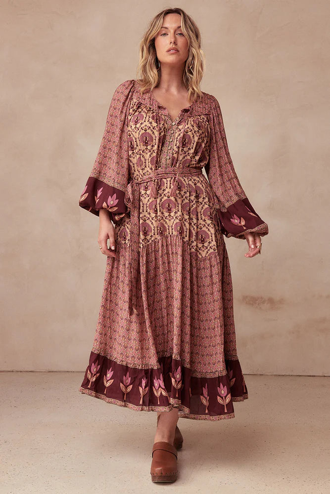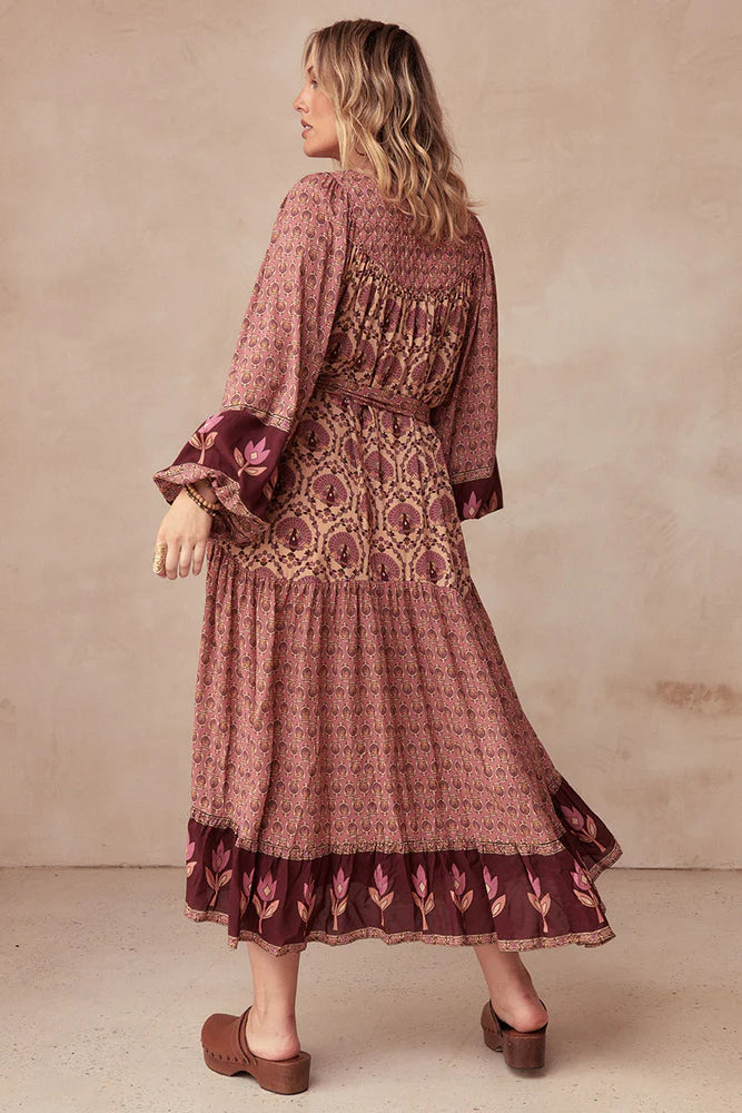 The Château Boho Gown in Grape is crafted for the wild and wanderlust. Arriving in dreamy hues of deep purple, smokey pinks and honeyed amber our Gown is a visual masterpiece. Our Gown features a quilted yoke, neck ties with tassels and custom beads, a captivating curved tier detail and a detachable tie belt for styling versatility.
