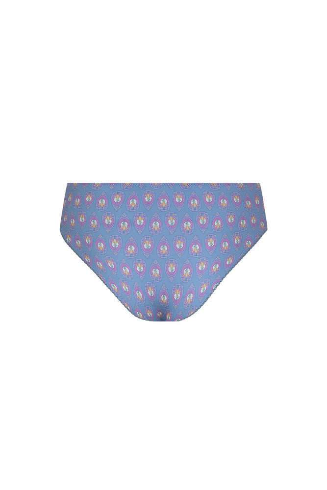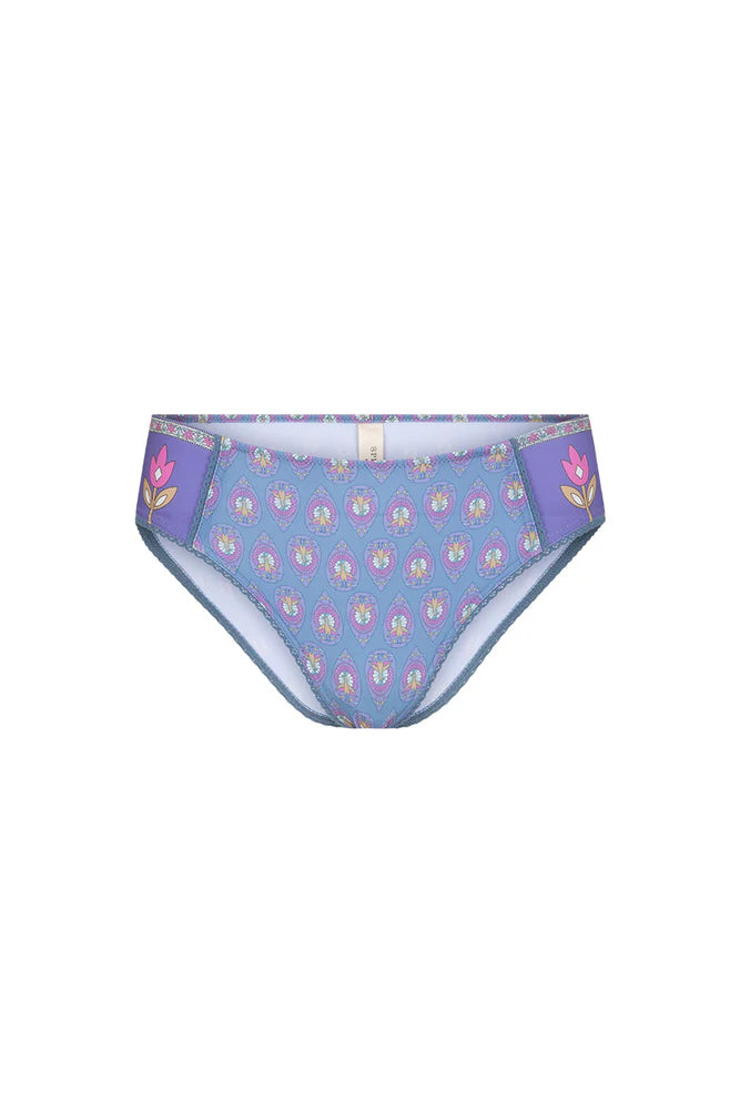 Our Château Brief in Lavender is a Spell favourite style arriving in a dreamy new colourway. A cheeky cut, our Brief is both flattering and comfortable. A great gift idea, our Brief features hand drawn blooms and peacock motifs in cornflower blues, pinks and velvety purples with a stunning border detail. Designed to be worn as intimates that can double as swim, we recommend pairing with the Château Bralette for some relaxed vacay glam.