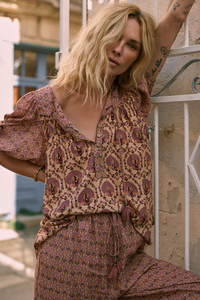 Our Château Short Sleeve Blouse in Grape is reminiscent of our ‘sold out in seconds’ Impala Lily Short Sleeve Blouse with some added intrigue. Our Blouse features a quilted yoke detail, ties with tassels and custom charms and our signature Château print with other wordly Peacock and bloom motifs throughout. Pair our blouse with the Muse Denim Shorts and chunky sandals for a casual affair or with the Château Adjustable Harem Pant and clogs for some effortless bohemian goddess glam.