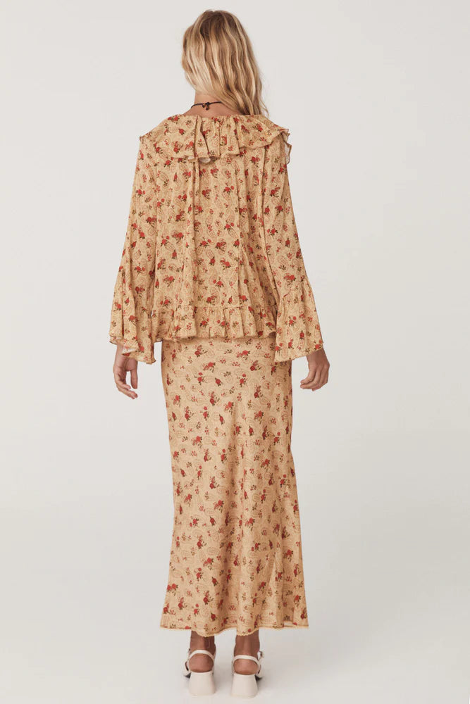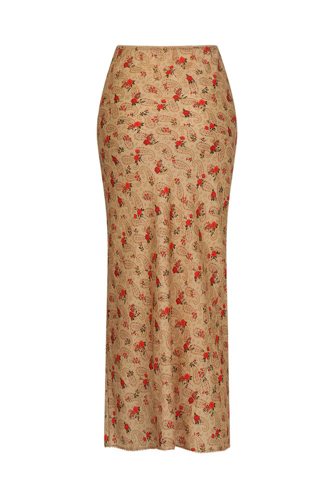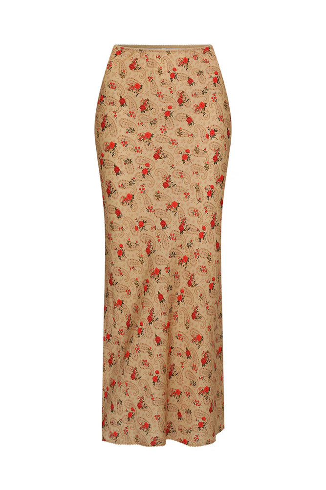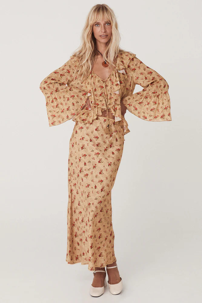 The Fleur Bias Skirt in Butterscotch arrives as if plucked from a french fairy tale. The bias cut glides over the hips offering a flattering silhouette for the wearer. An elastic waistband with lace trim offers a dreamy allure with the option to wear at the waist or hip for styling versatility. Crafted in a silk like fabrication with an all over ditsy print, our skirt adds a touch of opulence to your fit.