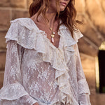 The Labyrinth Lace Blouse in Cloud Cream is pure romantic rebellion. Crafted from 90% recycled polyamide with just enough stretch, this unlined lace beauty features delicate front ties and a ruffled neckline. The shaped hem and tiered fluted sleeves add movement and dimension, while the intricate lace pattern captures a dreamy, ethereal vibe. Layer over our lace Lovers Bralette for an instant dose of goddess energy.