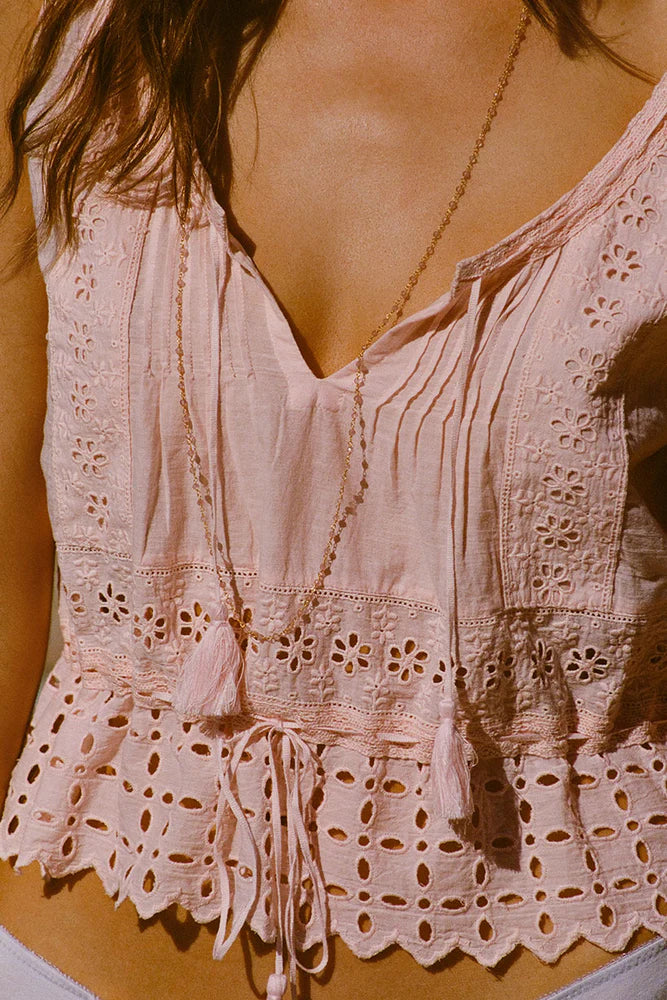 Our Love in the Afternoon Lace Cami in Rose Water is delicately crafted for the rebel romantics. Made from 100% organic cotton voile, this cami features intricate custom schiffli and broderie anglaise patterns in the fabric. Pleats and delicate neck ties with tassels add a whimsical touch while adjustable ties with tassels at the waist offer styling versatility ~ Pull the waist ties tight for a cinched silhouette or leave open and loose for an undone effect. Pair with denim and sandals for brunch with the girls or with the Love in the Afternoon Lace Maxi Skirt and kitten heels for an elevated affair. Our cami embodies freedom and timeless elegance no matter the occasion.