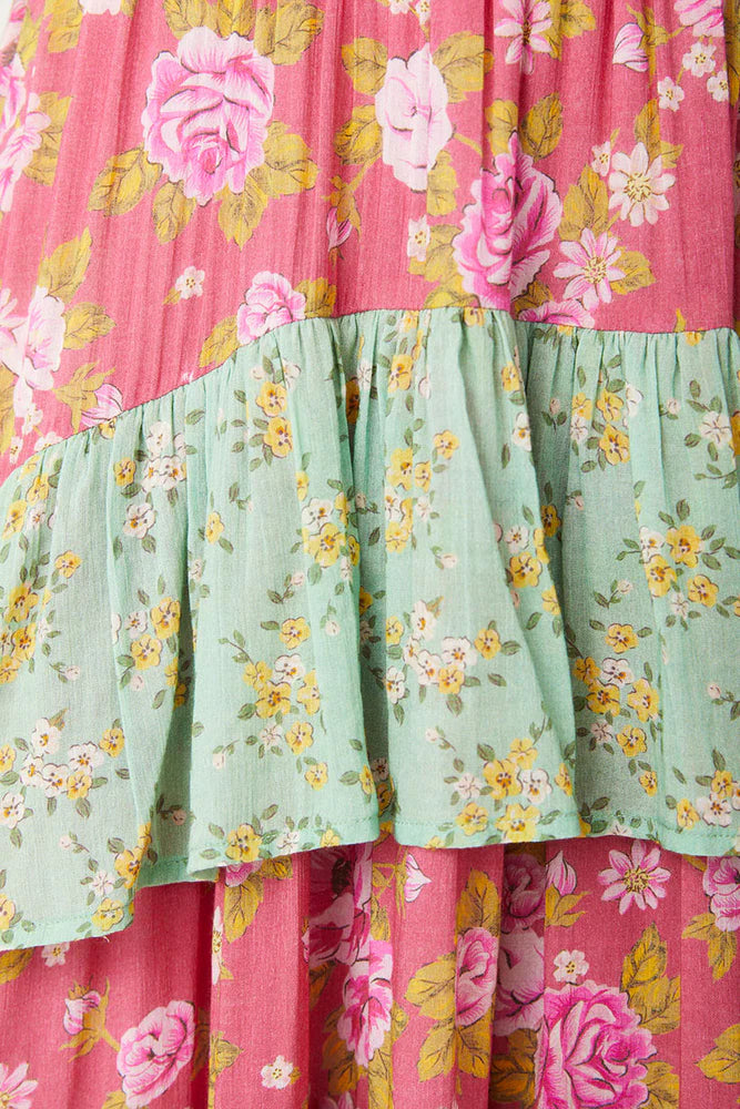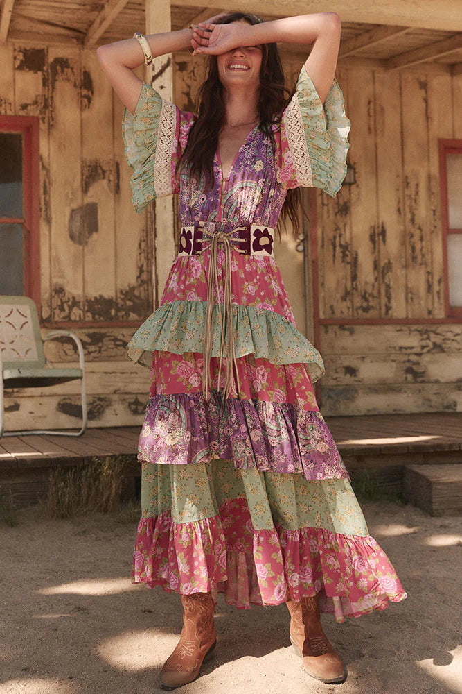 Introducing the Melody Ra-Ra Gown in Beatnik. The hero piece of this collection, this gown captivates hearts and conjures our inner rock goddess. A profusion of Beatnik colour and movement, our gown features tier upon tier of cascading blooms that create a breathtaking visual allure. Bold ribbons of crochet lace add a little flower child whimsy, overall embodying the free-spirited and self-assured essence of our muse. We see this one worn with vintage boots and layered accessories whilst kicking up dust under festival lights or paired with wedges and delicate jewels for a sunset soiree.
