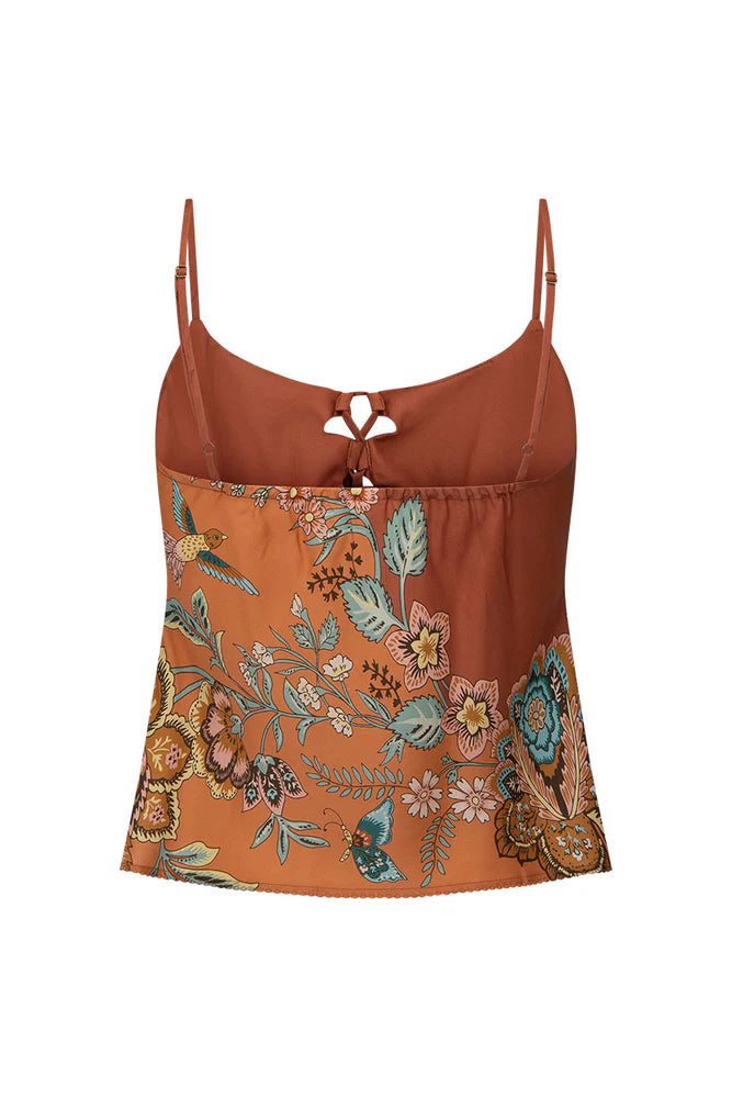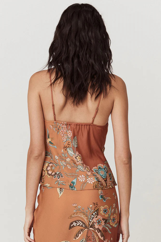 Our Mojave Lily Lace Up Cami in Amber is a slinky new style that combines design detailing with innovation. Each panel's print placement is engineered specifically for the garment, showcasing colour blocking in amber and hazelnut tones with the signature Mojave Lily print acting as a striking border between the hues. The lace-up front detail, complete with wooden beads and tassels, only heightens her opulence, while shaping under the bust enhances a flattering fit that skims down to the hip. Pair with our Mojave Lily Bias Skirt and fine jewels for a rooftop soiree at sunset.