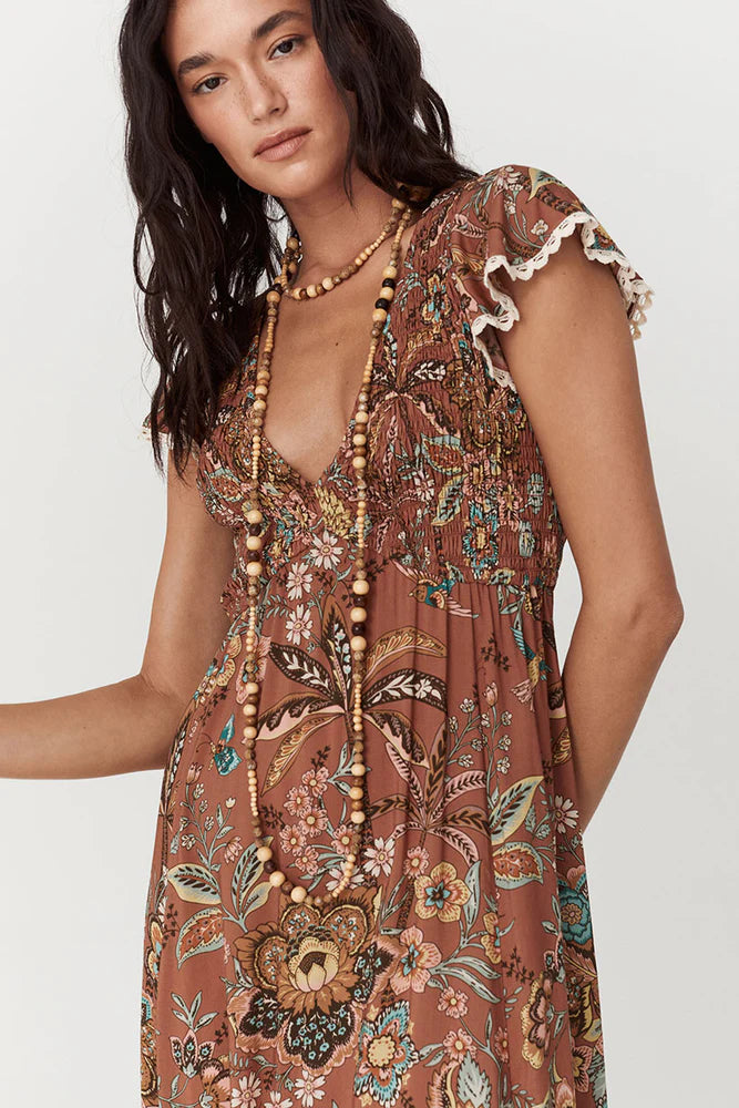 Our Mojave Lily Shirred Maxi Dress in Amber is an alluring masterpiece that invites you into a desertscape in full bloom. With a fully shirred bodice and elasticated waist, this silhouette flatters effortlessly, embracing the curves. The deep V-neckline and flutter sleeves add a hint of romance, while amber and earthy hues bring the print to life, adorned with flowering palms, blooms and exotic birds. We imagine our dress paired with flats and a cardigan for date night or with a heel and fine jewels for an elevated affair.
