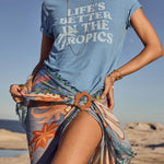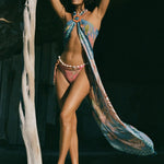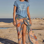 Wrap yourself in bright style with our Oceana Travel Scarf. Made with custom Spell Oceana print in sea blue, this one-size scarf features a frayed edge and a removable sarong buckle for added versatility. Perfect for topping off any outfit or pairing with our Oceana swim pieces for a playful beach look. Also available in coral.