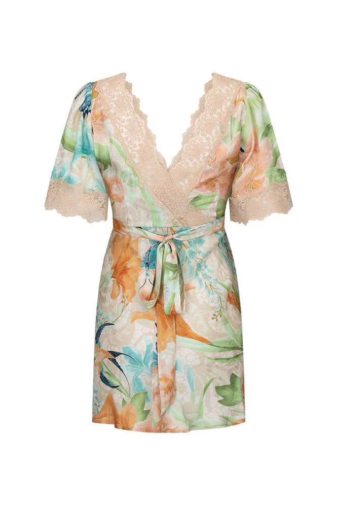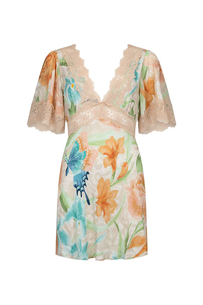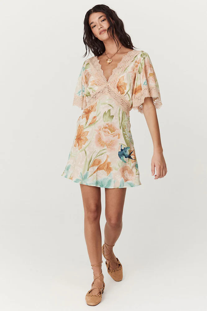 The Painter’s Garden Lace Mini Dress in Seafoam combines nostalgic charm with a modern twist. Inspired by the delicate beauty of 1930s slips, this dress combines antique lace details with painterly florals that float across a silky jacquard base. Fluttering sleeves and a bias cut skirt flatter the silhouette. Perfect for unhurried days and romantic nights, this piece captures the essence of timeless charm. Pair with delicate strappy sandals and fine jewels for an effortless day to night look.
