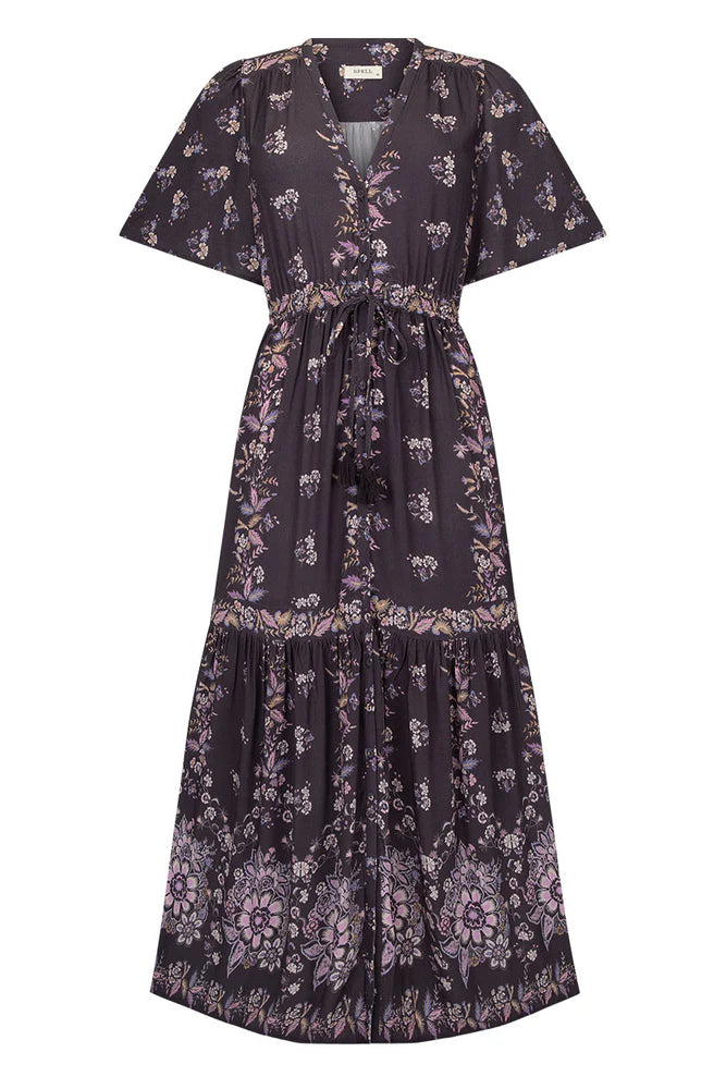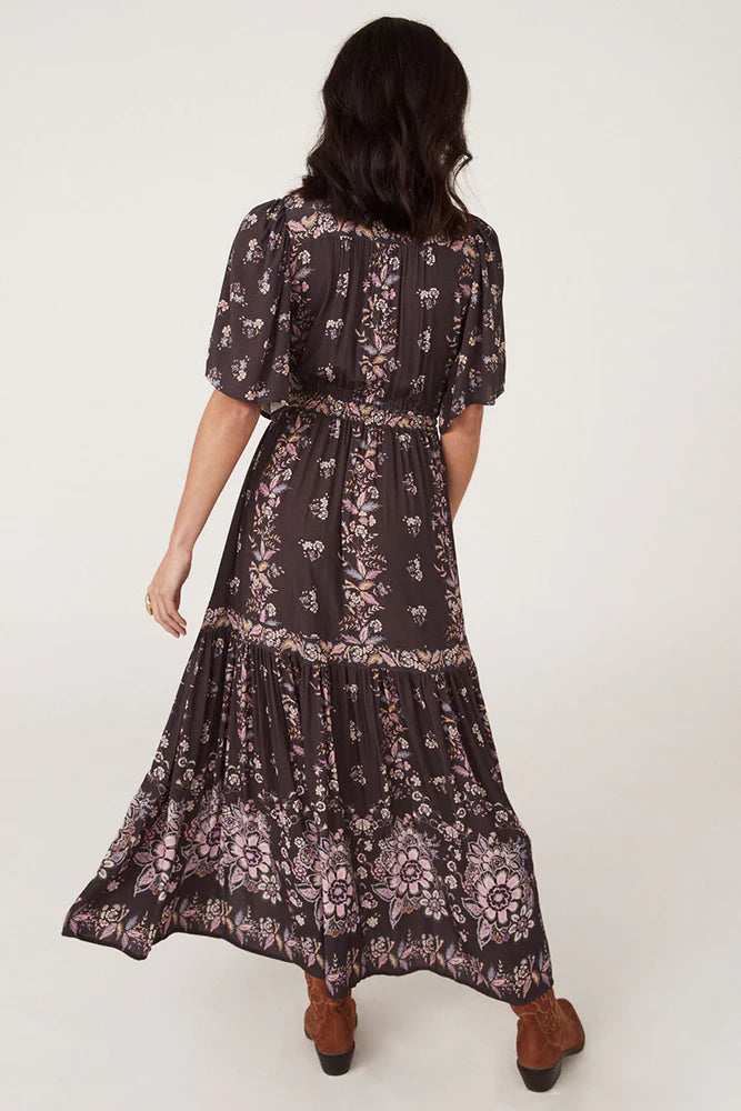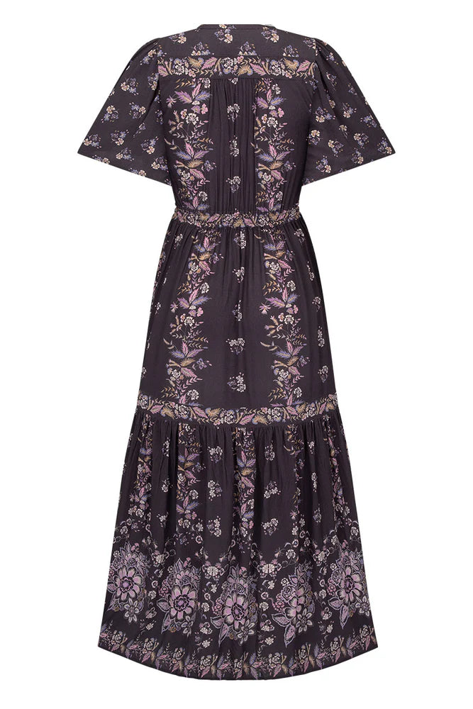 Our Rebel Spirit Gown in Hyacinth offers ethereal beauty with feminine mystique. With its sweeping silhouette, this gown is designed to move with you. Featuring a flattering elasticated waist with functional tassel ties, a yoke with border detailing and a voluminous skirt with a striking border detail at the hem for an overall dramatic and whimsical effect. Our charcoal base colourway is designed to effortlessly pair back with any accessories, choose a tan mule and statement bag for a garden soiree or cowboy boots and layered accessories to capture your true rebel spirit.