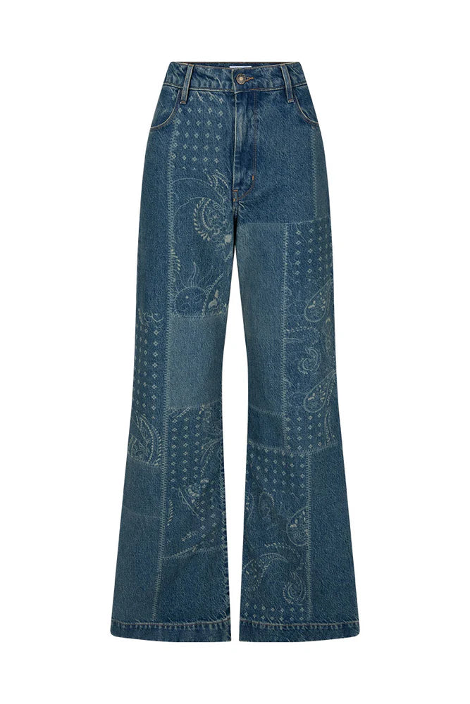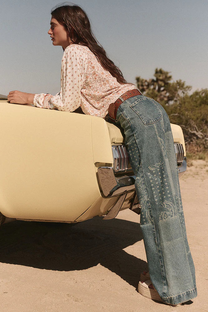 Our Road Trip Denim Jean in Bandana is created for adventure seekers. Fit to perfection with a flattering high waist and wide leg, our jeans offer statement style with an effortless allure. Our design team have created a custom western inspired print with sun and moon motifs, paisley patterns, and ditsy florals in a patchwork design that is then laser-printed onto the denim with an allover vintage wash to finish creating a unique and 70’s flower child inspired look. We imagine these styled with our Sunshine Bandit Organic Singlet, point toe cowboy boots and belt to complete your fit or with our Road Trip Denim Vest Dress for a layered look.