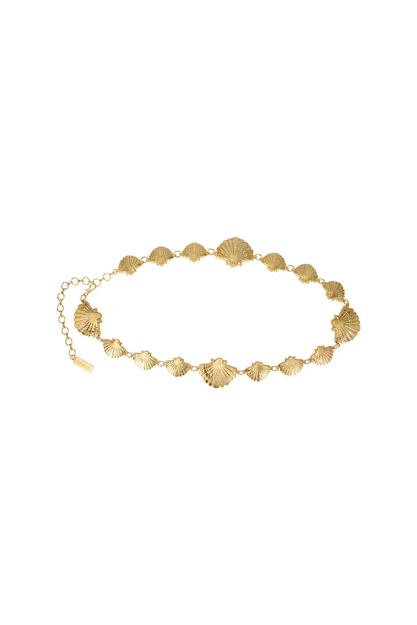 The Villa Tropic Chain Belt in gleaming gold is the perfect playful accessory to brighten any outfit. Crafted from a durable zinc and aluminium blend, it features four bold shell motifs paired with twelve smaller ones, creating a fun, beachy vibe. Finished with iconic gold Spell branded hardware, this belt adds a touch of tropical charm and shine to your waist, effortlessly elevating your look for day or night adventures.