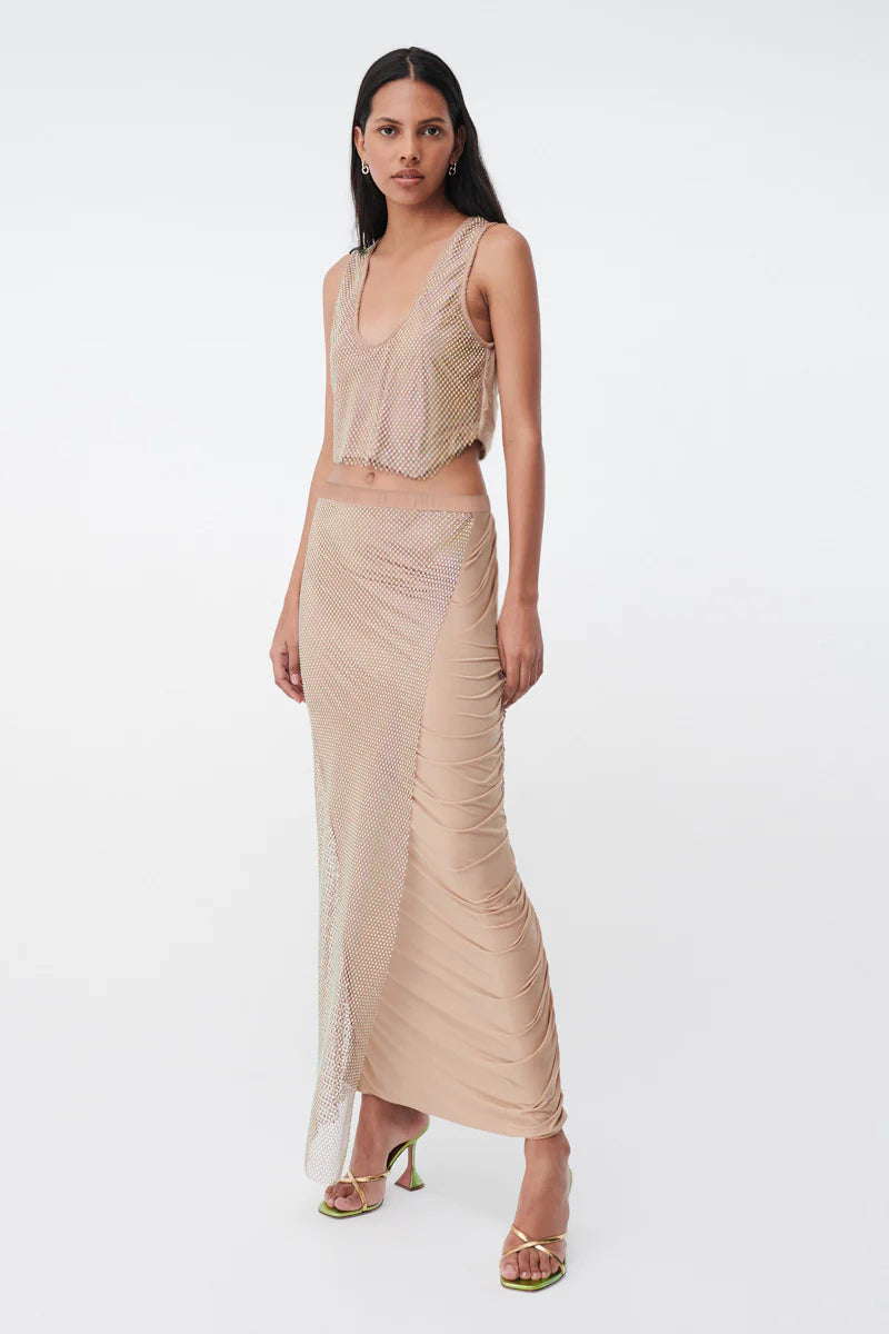 THE PERFECT OUTFIT FOR A NIGHT OUT. MEET THE DALI WRAP MAXI SKIRT. THE SKIRT FEATURES A CRYSTAL MESH JERSEY MATERIAL THAT HAS FLATTERING DRAPING TO SCULPT TO YOUR BODY. PAIR WITH THE DALI CROPPED TANK.