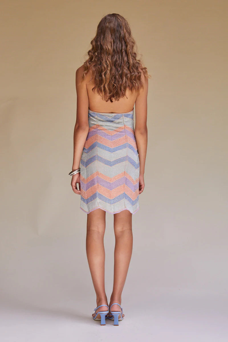 Go from beach to bar in the Kiki Chevron Halter Mini Dress. Made from chevron metallic fine knit, featuring a halter neckline, this mini dress will definitely turn heads.