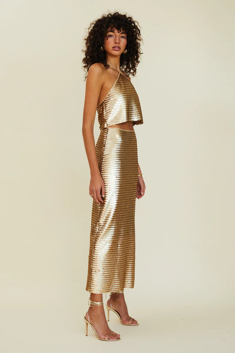 PERFECT FOR A NIGHT OUT. MEET THE PYRA STRAPPY HALTER TOP. FEATURING A HALTER NECKLINE AND HAS AN OPEN TIE BACK. PAIR BACK WITH THE PYRA HIGH SPLIT MAXI SKIRT FOR THE PERFECT NIGHT OUT LOOK.