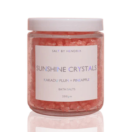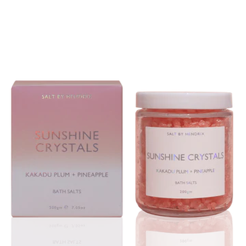 SALT BY HENDRIX Sunshine Crystals are bath salts infused with Kakadu Plum & Pineapple for the ultimate bath routine. These bath salts are made from Southern Dead Sea Salts that focus on calming the skin with anti-inflammatory and skin brightening properties. These contain gentle AHA's and BHA's.