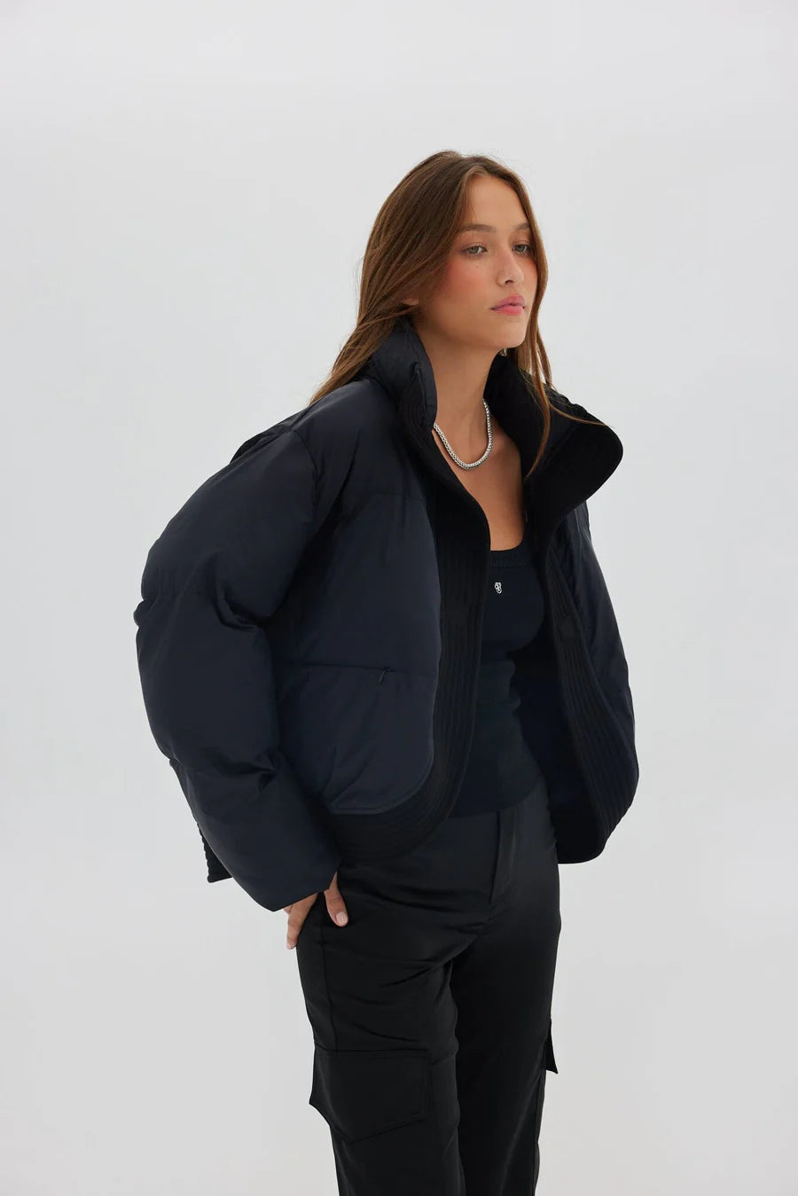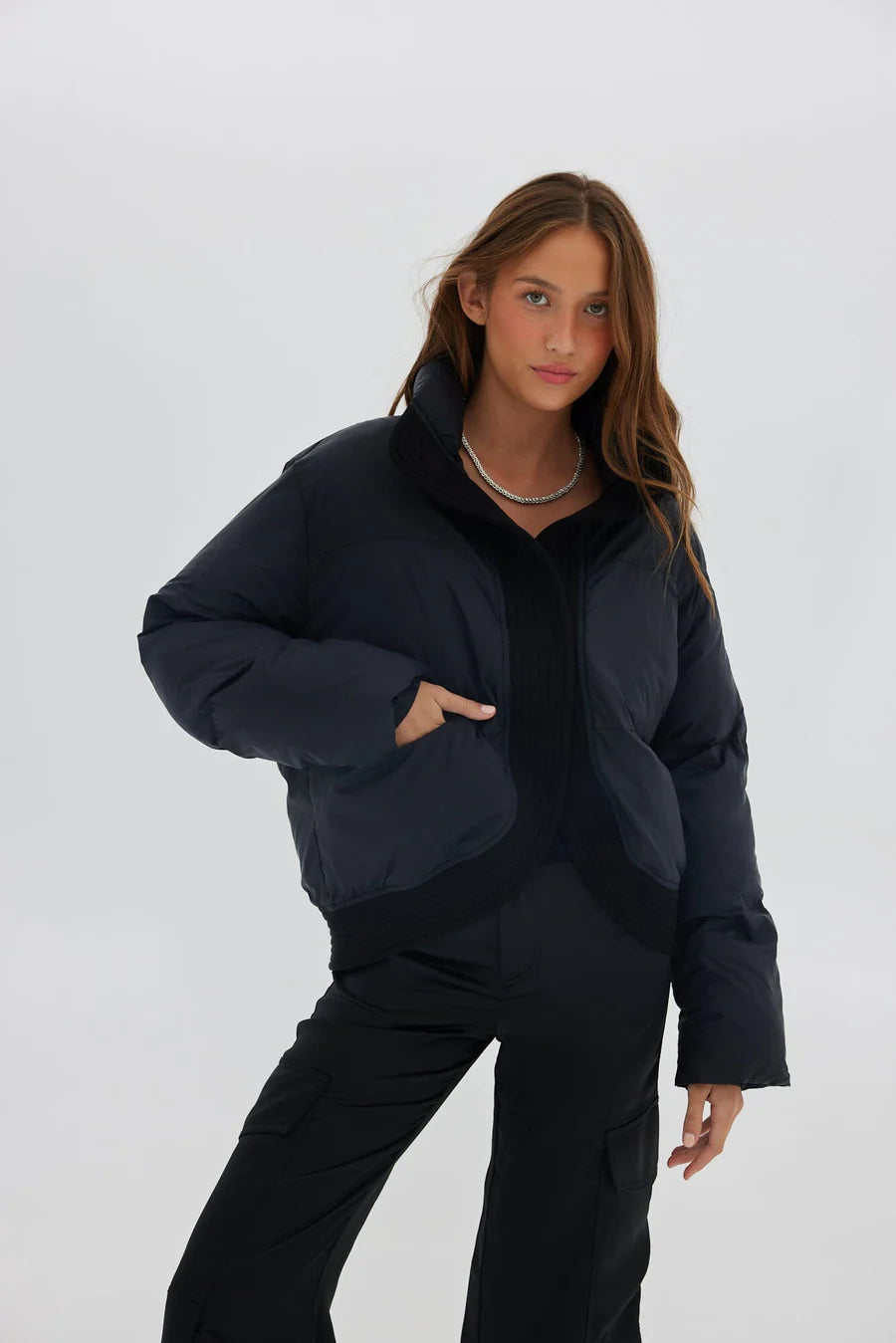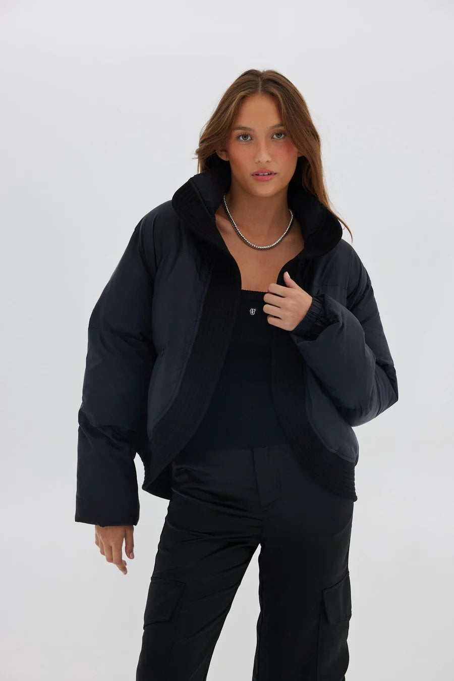 Elevate your winter style with the Curved Front Puffer by Toast Society. A cropped, chic style featuring a distinctive curved front, magnetic fastening, and convenient front pockets for a perfect blend of fashion and functionality.