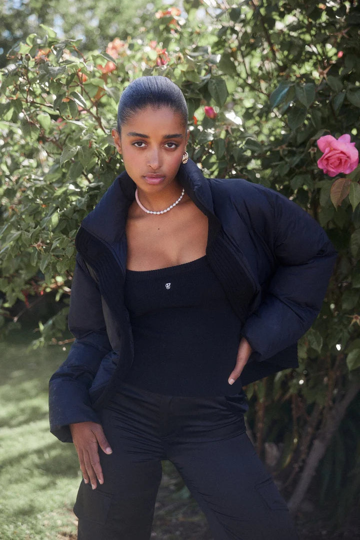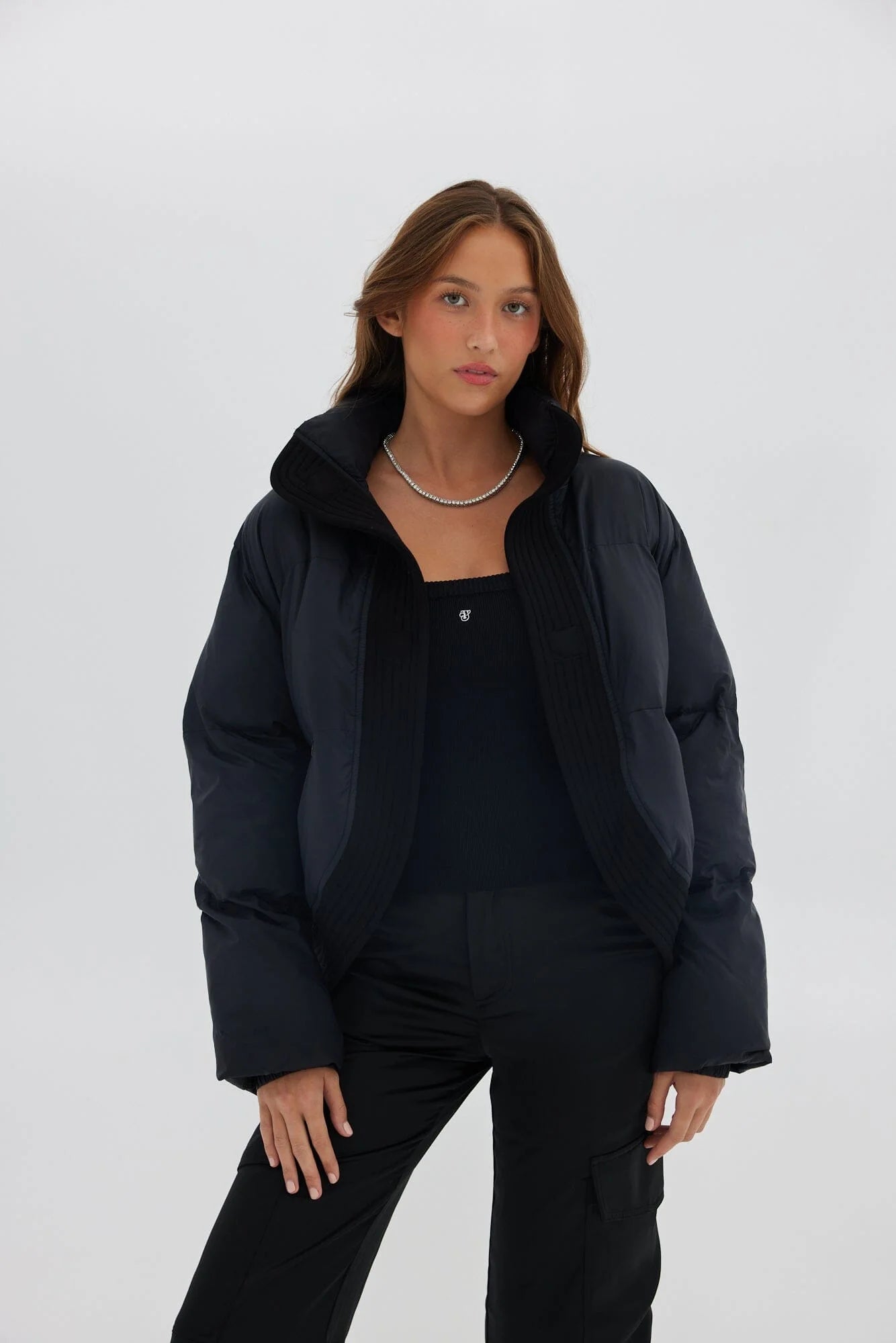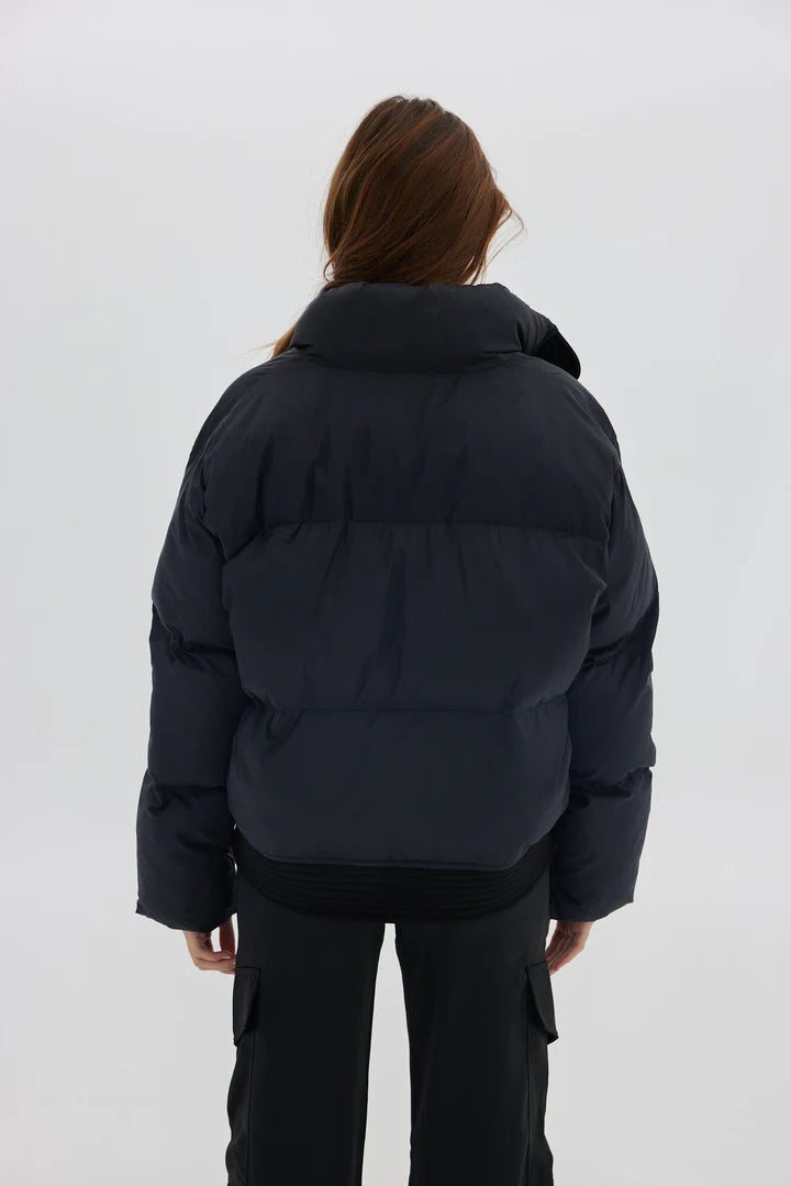 Elevate your winter style with the Curved Front Puffer by Toast Society. A cropped, chic style featuring a distinctive curved front, magnetic fastening, and convenient front pockets for a perfect blend of fashion and functionality.