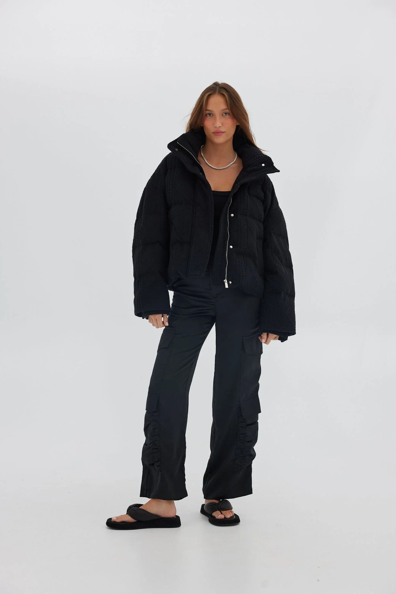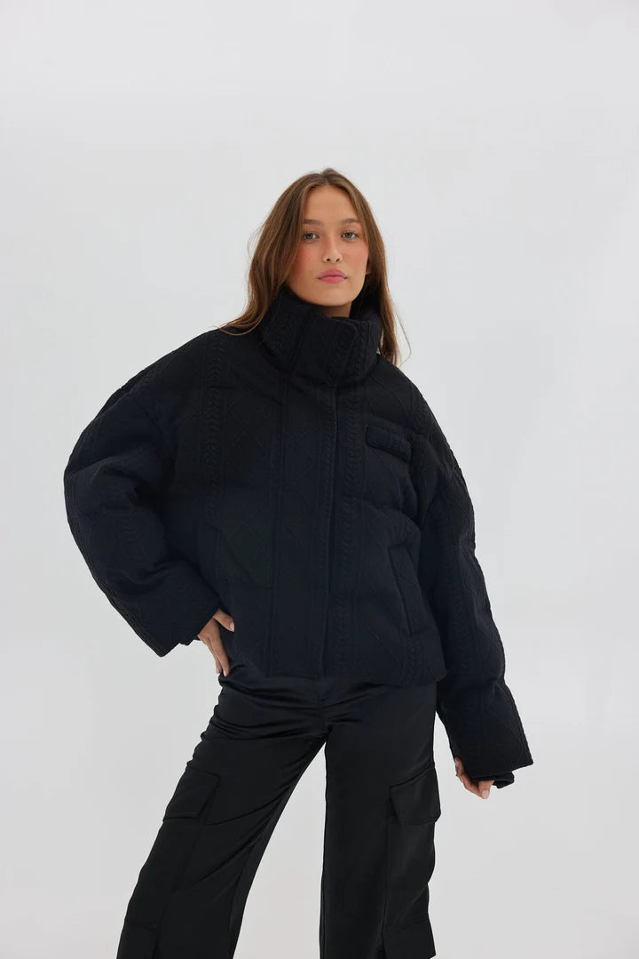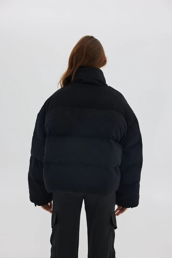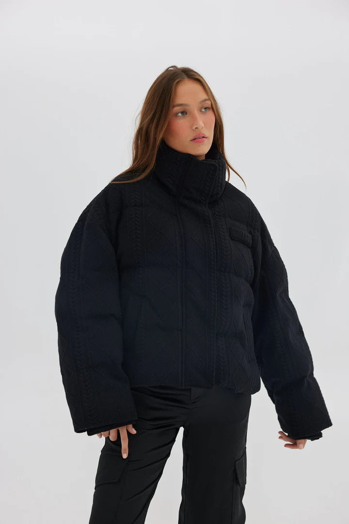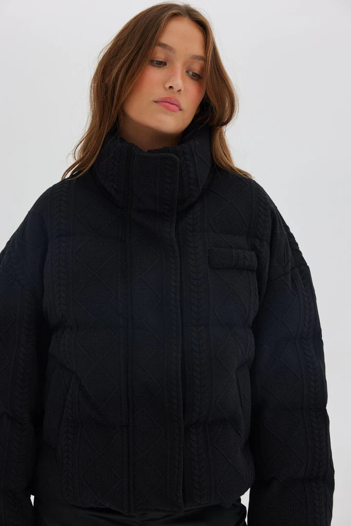 Stay cozy in style with the Patterned Puffer by Toast Society, showcasing a unique knit design on the outer shell, a practical zip-up feature, a sleek flat zip cover with button fastening, and a distinctive pocket detail on the chest.
