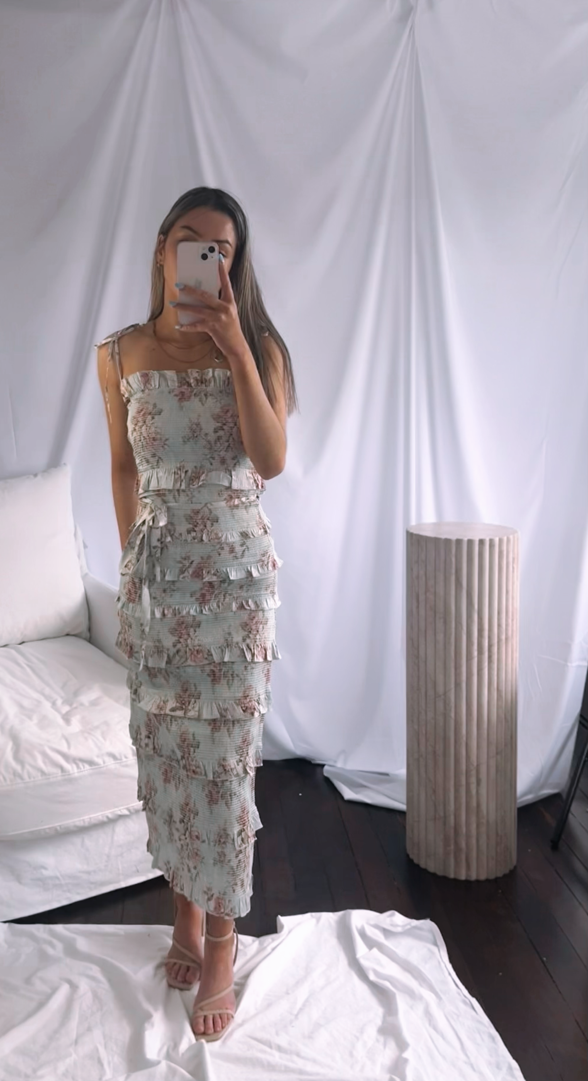 The Lily Dress is a midi length elastic ruched dress with small ruffles all the way down. She scrunches you in and makes you feel fun and flirty! Sizing is easy on Lily because she is so stretchy! Go up or down a size and she will still fit!