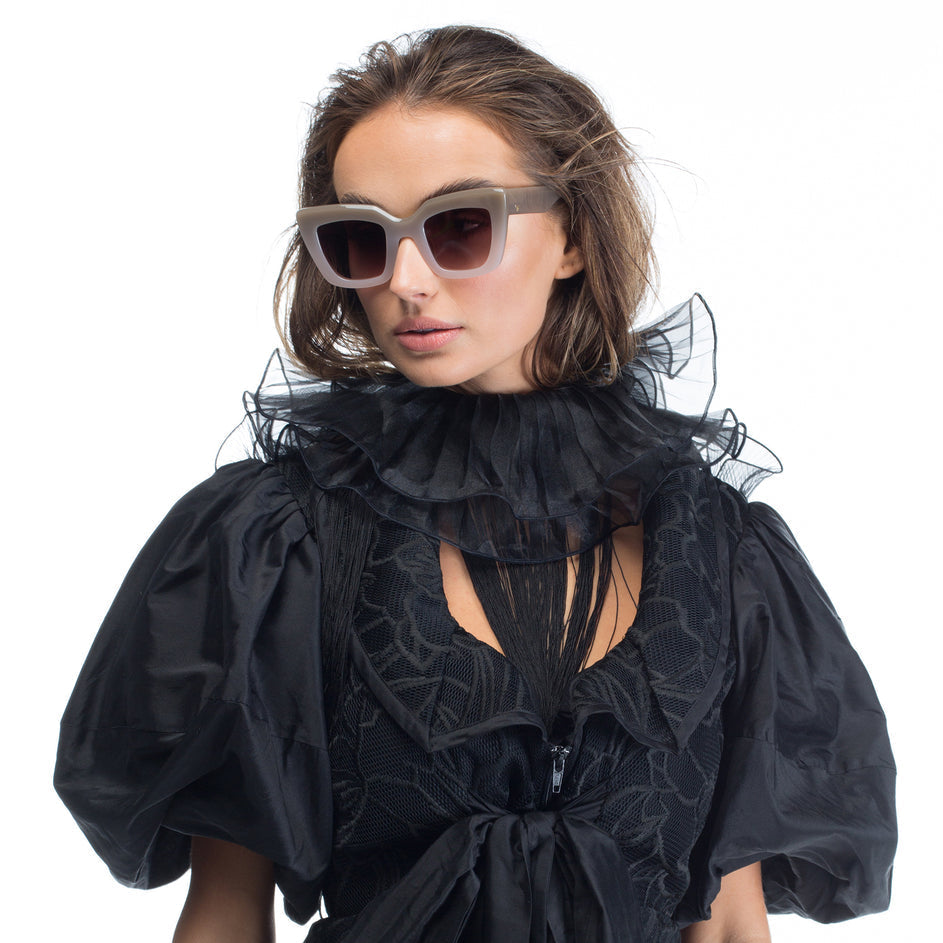 A cat-eye inspired silhouette that embodies confidence. This style encompasses zero base Italian nylon flat lenses and is hand-crafted from premium acetate.