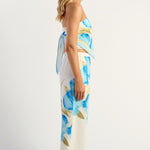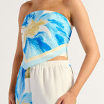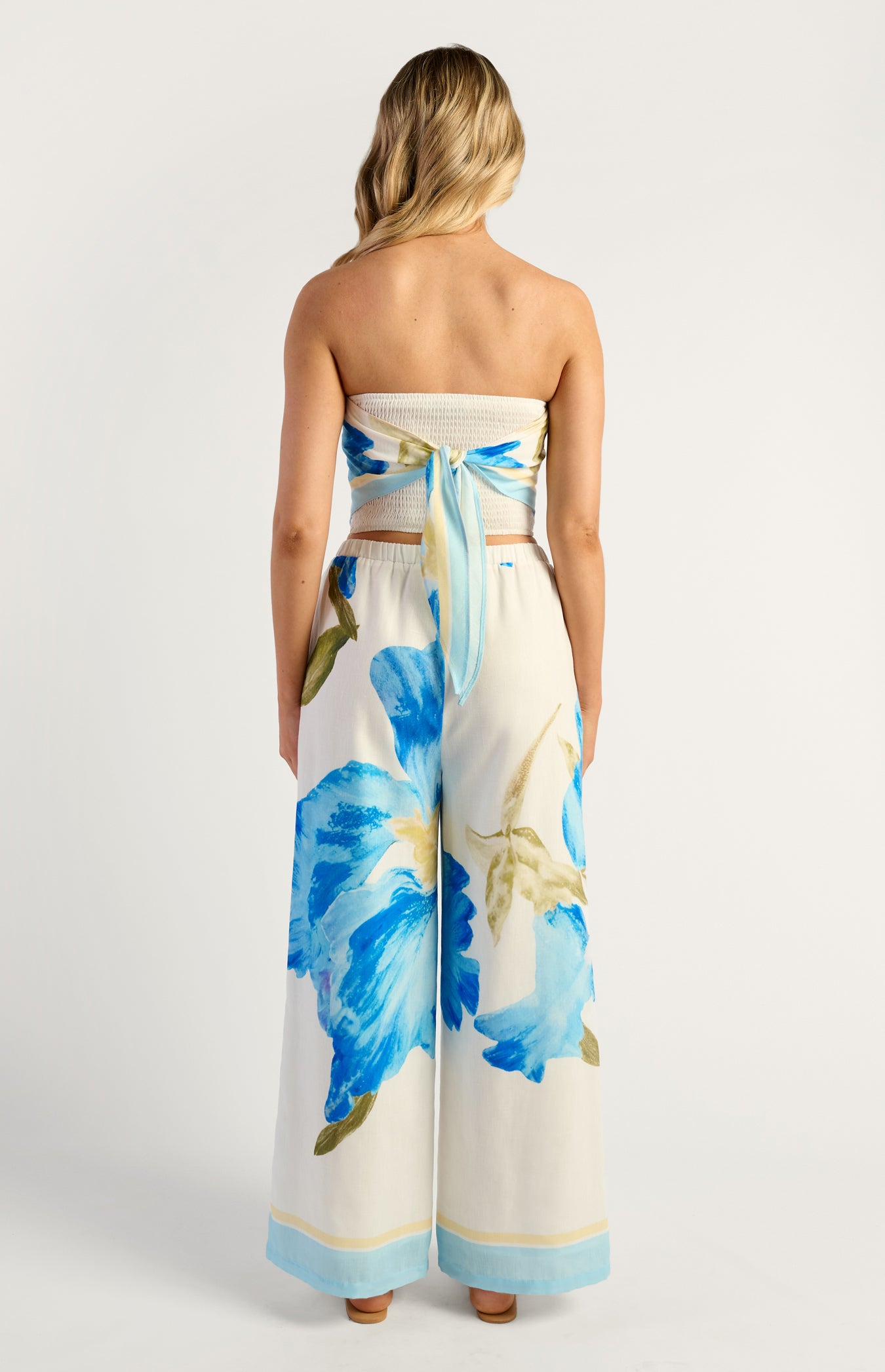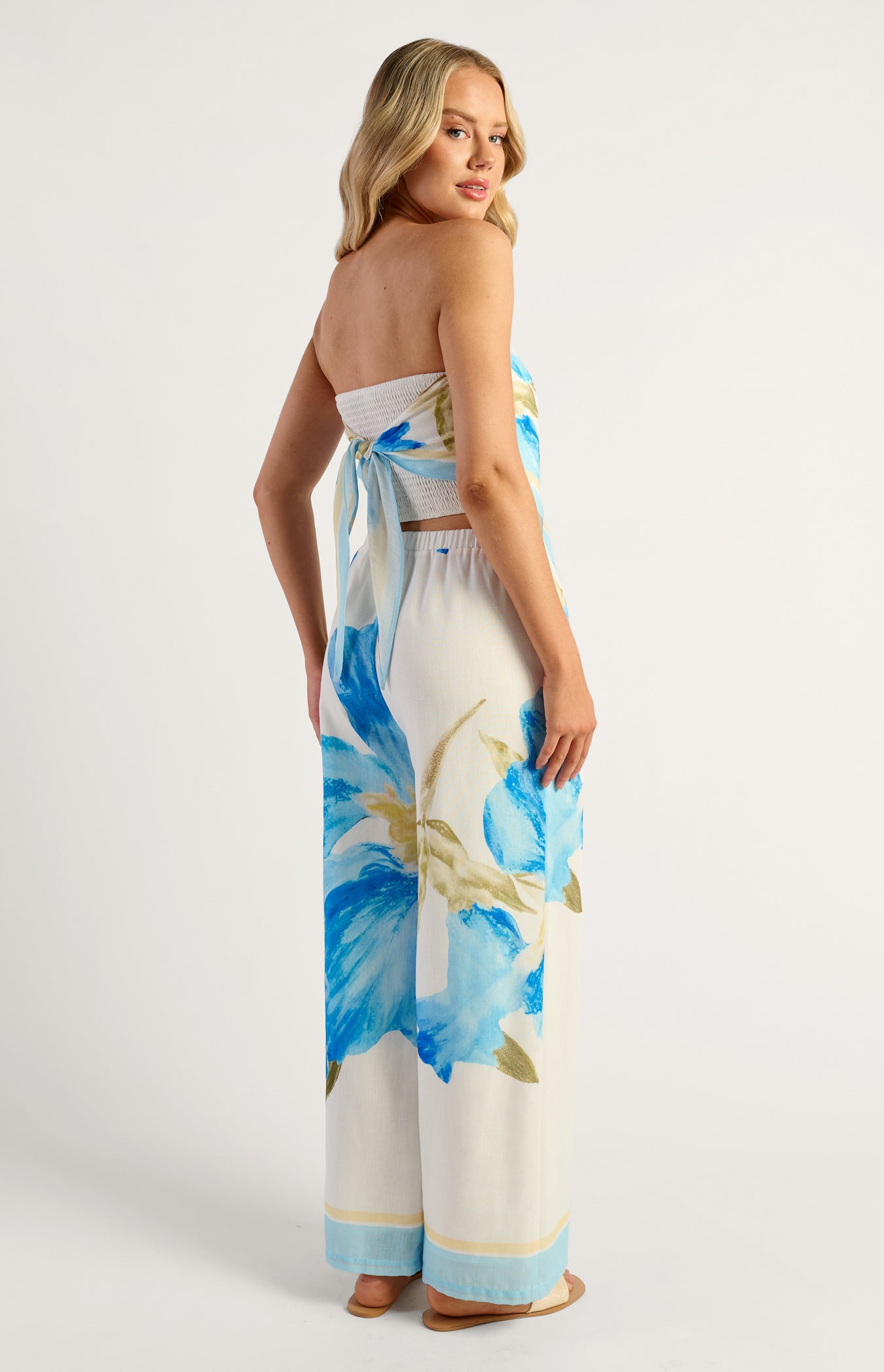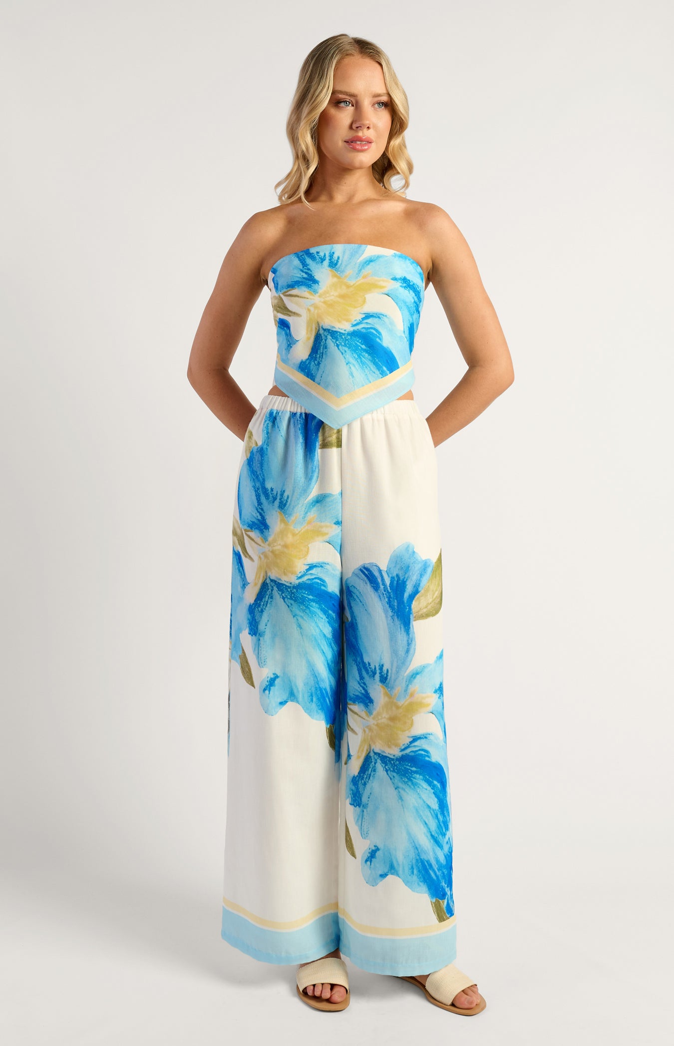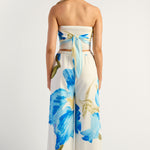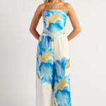 Bright and breezy, this matching set features a strapless scarf-style top and wide-leg pants in a bold blue floral print. Perfect for summer days or resort getaways — sold together as a complete set.