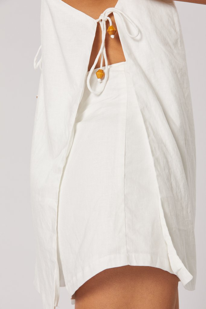 - Relaxed style short. Semi-detached overlay panels with string tie finish