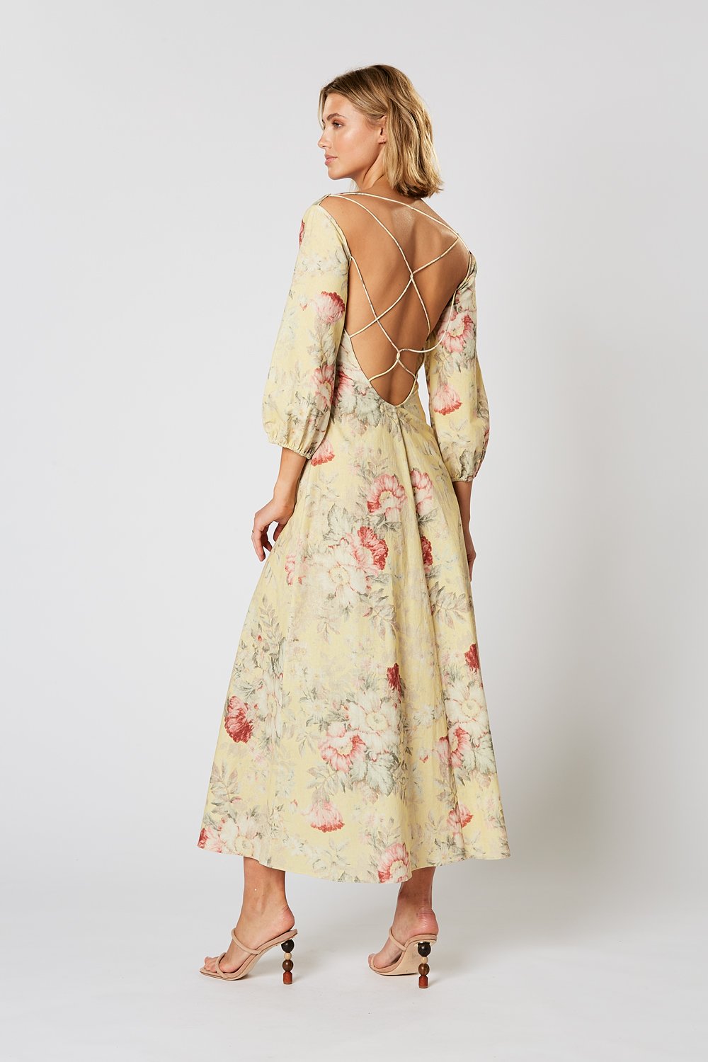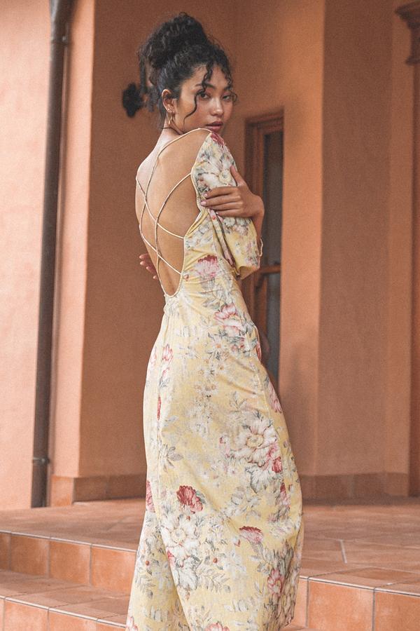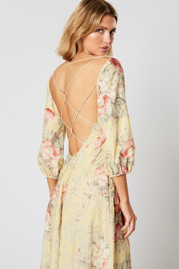 - V front rouleau button closure. Low open scoop back with string tie detailing